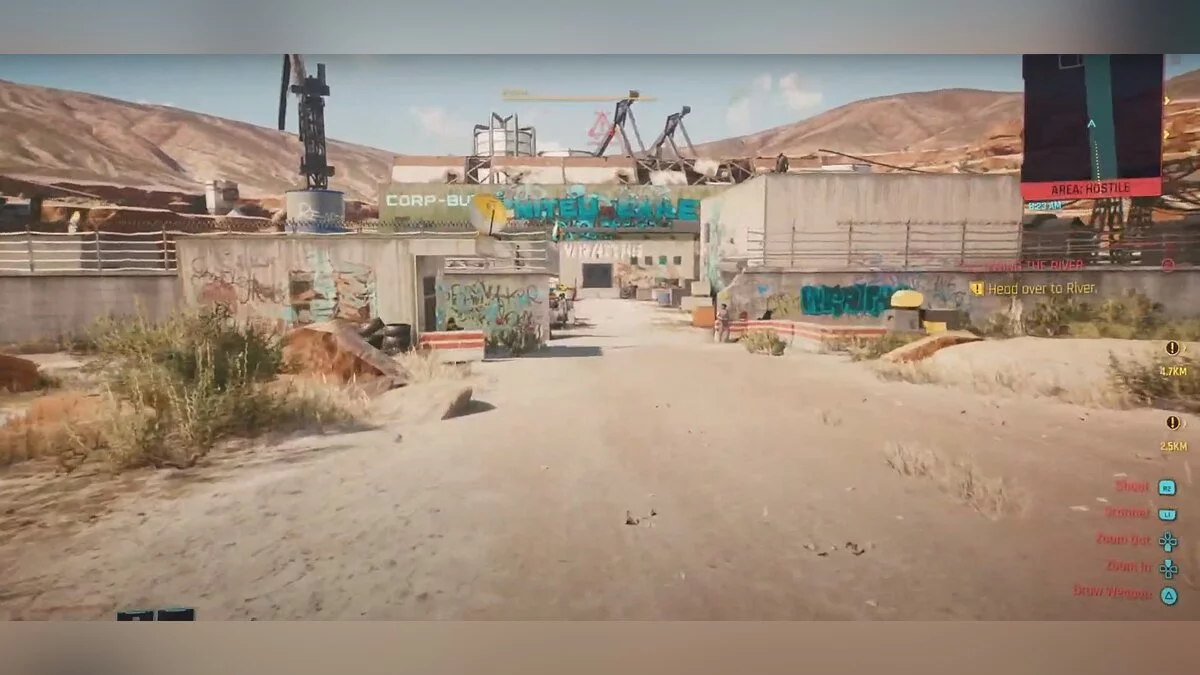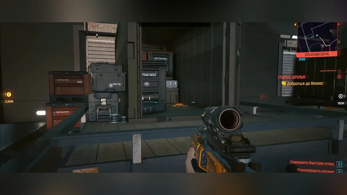 Следуем ко складу «Арасаки» в районе «Санто-Доминго» в квартале «Ранчо Коронадо» и идём от точки перемещения налево. Пробегаем через главные ворота и бежим вперёд до забора, никуда не сворачивая. В правом углу обнаруживаем строение и открытый контейнер с миной внутри. Отходим на пару шагов и уничтожаем устройство. Залезаем внутрь и забираем оружие из открытого ящика. Пистолет-пулемёт оснащен разрывными патронами и может поразить три вражеские цели одновременно.