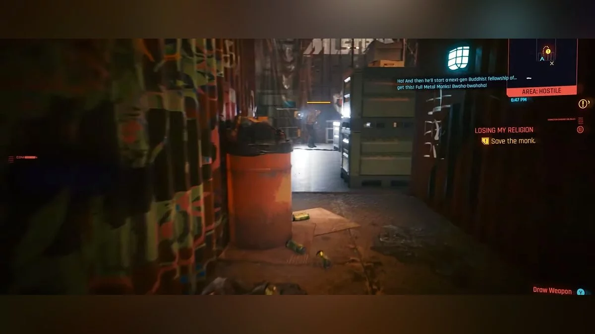 Следуем в самую западную точку района «Уотсон» на набережную квартала «Нортсайд». Разговариваем с монахом, который попросит героя спасти брата. Отправляемся к отмеченному на карте месту и вырубаем первого охранника. Задание можно выполнить при помощи стелса, однако достаточно всего лишь ворваться на базу врага с оружием наперевес. Расправляемся со всеми противниками и общаемся с монахом. На этом дополнительное задание «Священное и Мирское» будет завершено, а рядом со спасённым человеком на стойке слева будет лежать чертёж культового оружия, которое оснащено снарядами с высоким шансом поджога цели, имеет низкий разброс пуль и высокий термический урон.