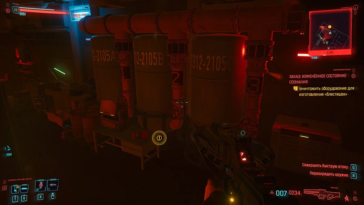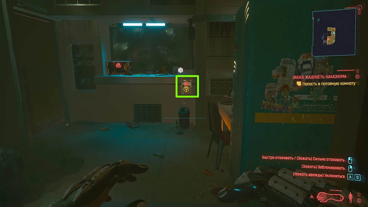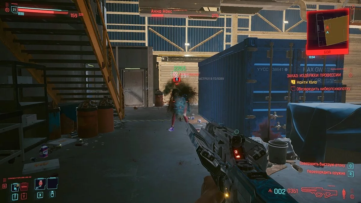 Когда победите киберпсиха, спуститесь на склад и постучите по синему контейнеру. После разговора с Хэлом заказ будет завершен.