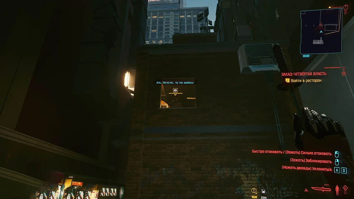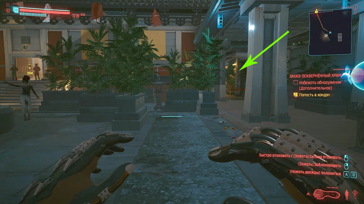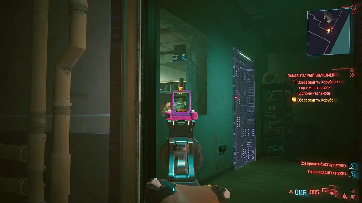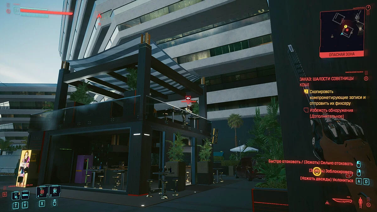 Заказ можно выполнить двумя способами: по-стелсу и с применением оружия. Если ранее вы приобрели кибериплант «укреплённые сухожилия», то перед входом в клуб посмотрите наверх. На третьем этаже вы увидите единственного противника на балконе. Нейтрализуйте его при помощи любого летального скрипта или метким выстрелом из оружия с глушителем.