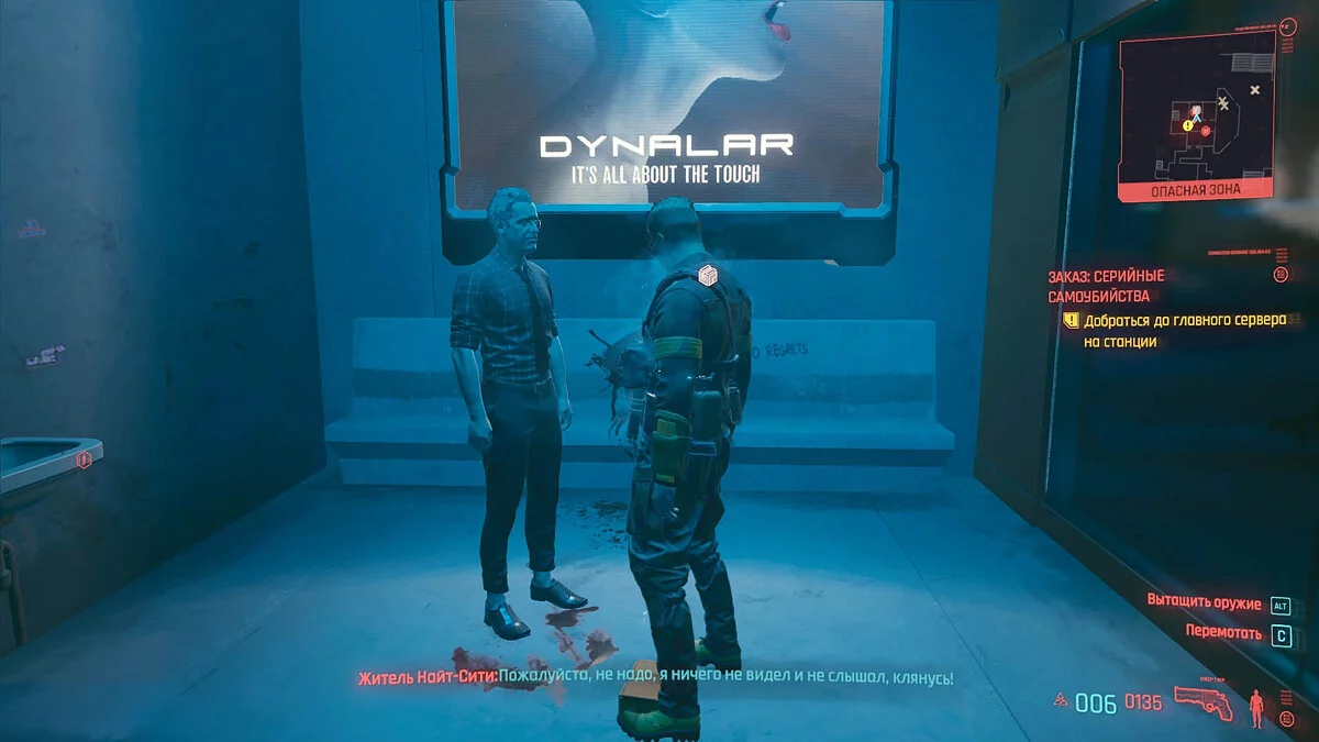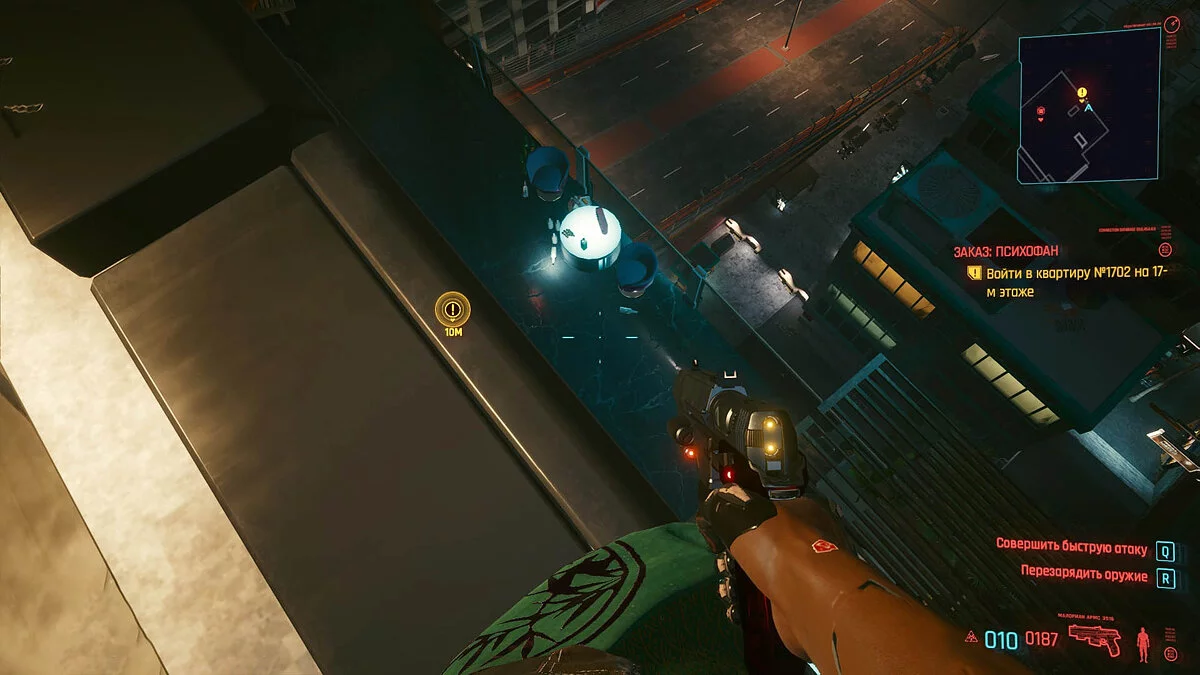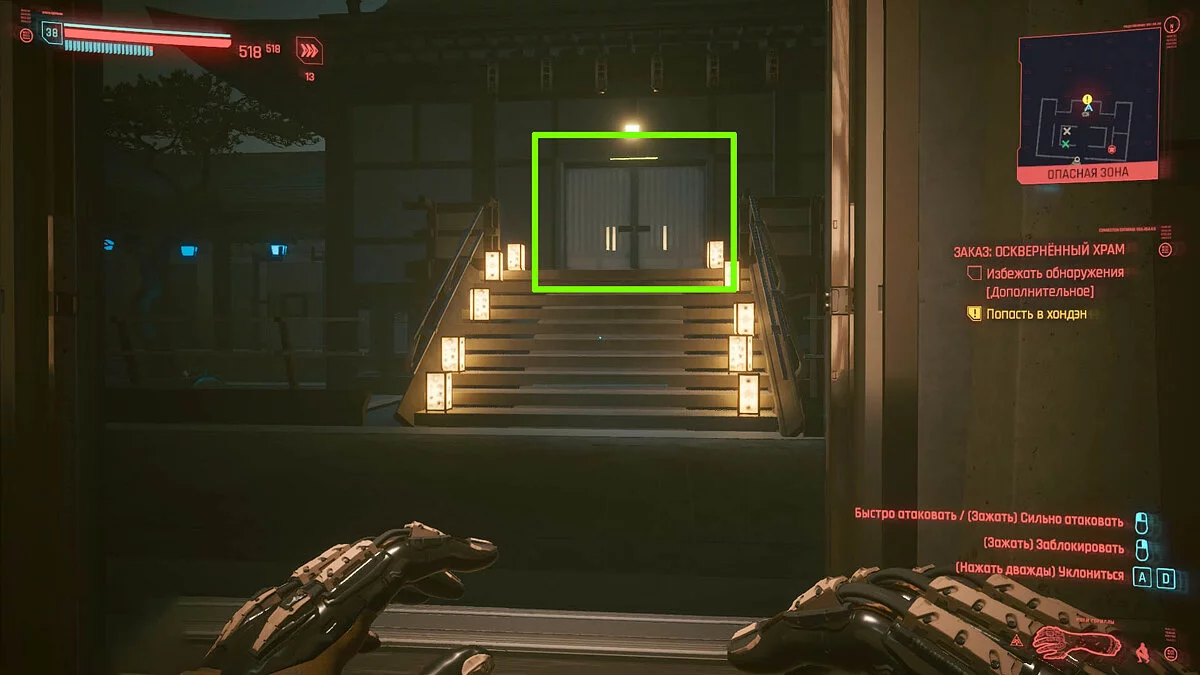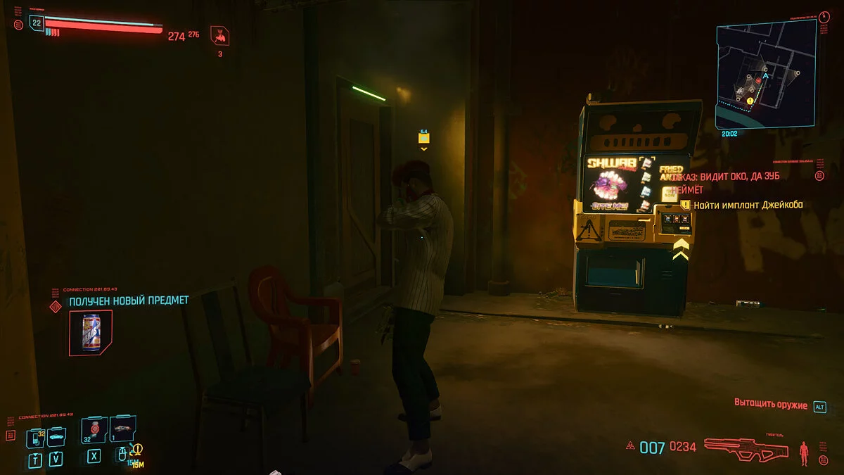 Заказ можно выполнить двумя способами: по-стелсу и с применением оружия. Если ранее вы приобрели кибериплант «укреплённые сухожилия», то перед входом в клуб посмотрите наверх. На третьем этаже вы увидите единственного противника на балконе. Нейтрализуйте его при помощи любого летального скрипта или метким выстрелом из оружия с глушителем.