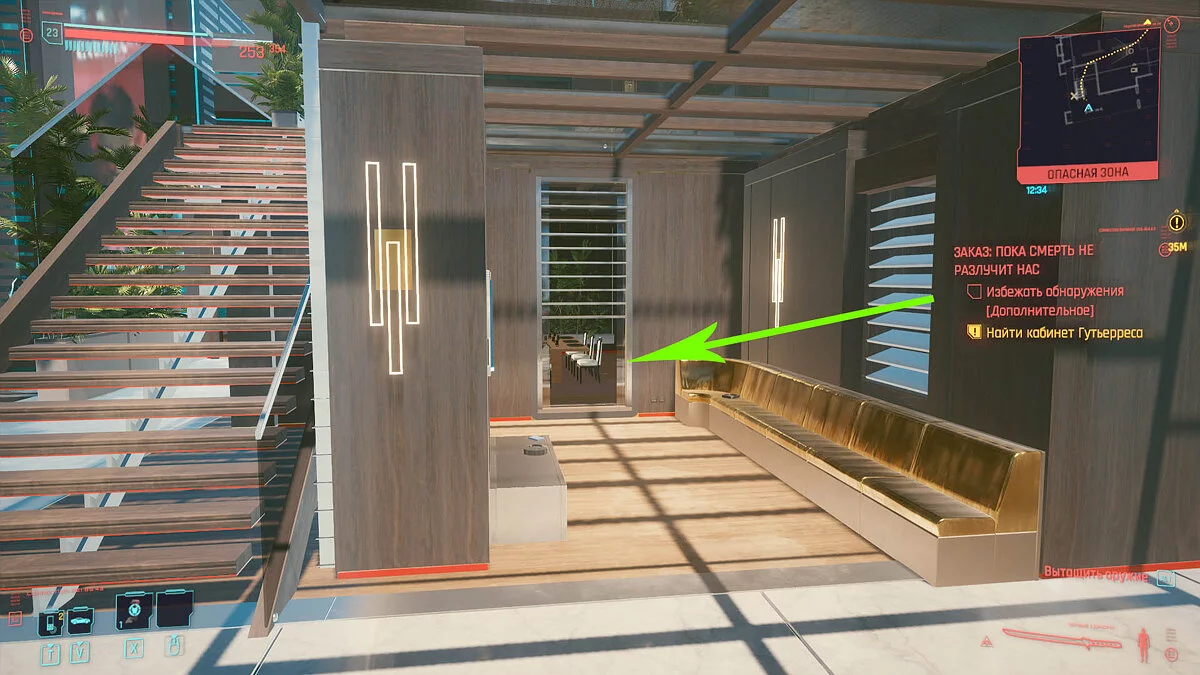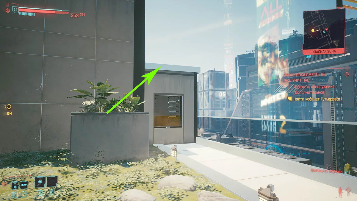 Заказ начнётся, когда вы переместитесь к мегабашне H6 в Арройо. Войдите в лифт и поднимитесь на верхний этаж. Здесь патрулируют около десяти врагов, а на всём пути расположены камеры видеонаблюдения. Пройдите по правой стороне, избавьтесь от двух бандитов и войдите в помещение.