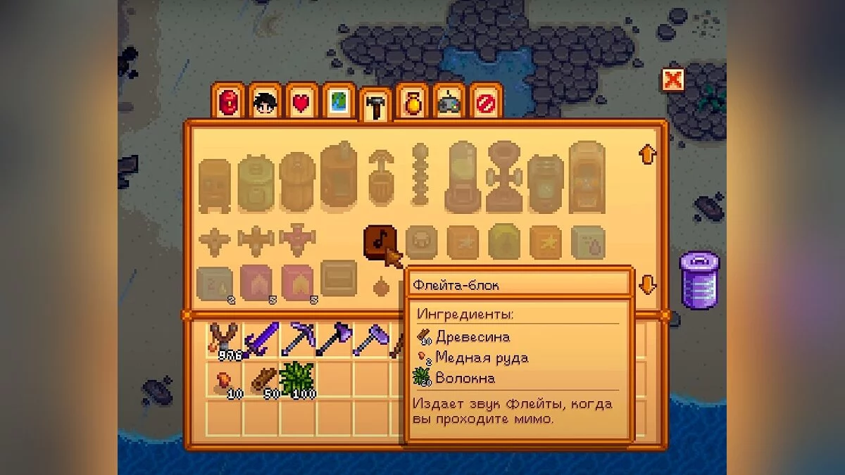 Для начала получаем у Робин рецепт флейта-блоков при наличии шести сердец. На крафт пяти предметов необходимо собрать следующие ресурсы: 50 древесины, 10 медной руды и 100 волокон.