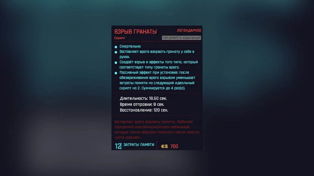 Активирует детонацию переносной гранаты у выбранной цели и снижает стоимость использования следующего скрипта.
