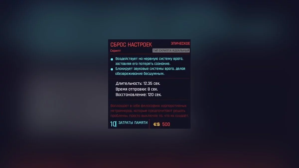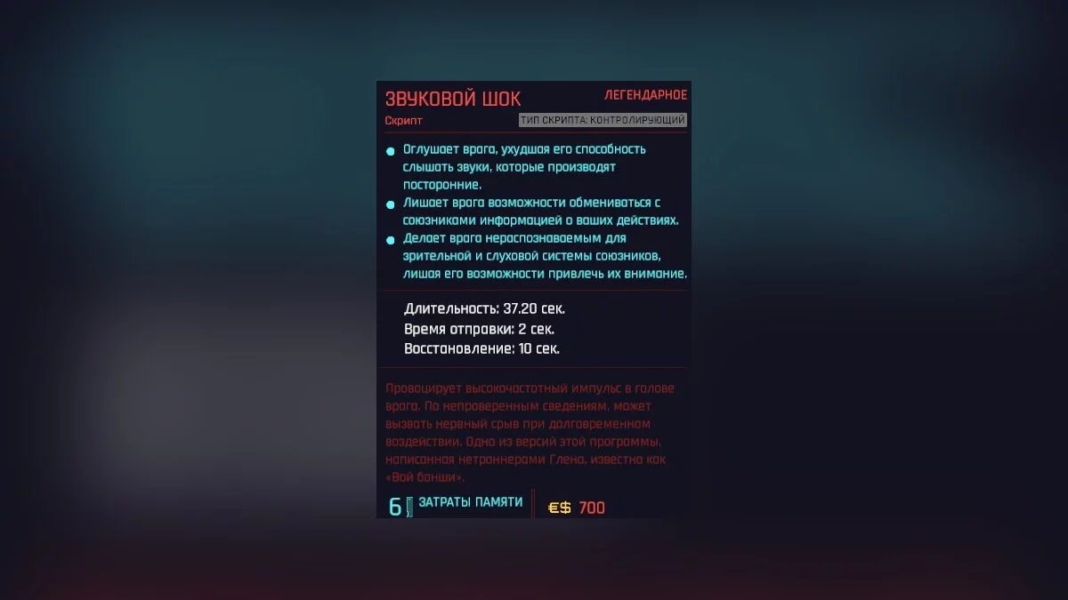 Калечит нервную систему противника и заставляет его терять сознание. Поражённая цель не будет производить никакого шума при отключении. Устранение врага снижает стоимость использования следующего скрипта.