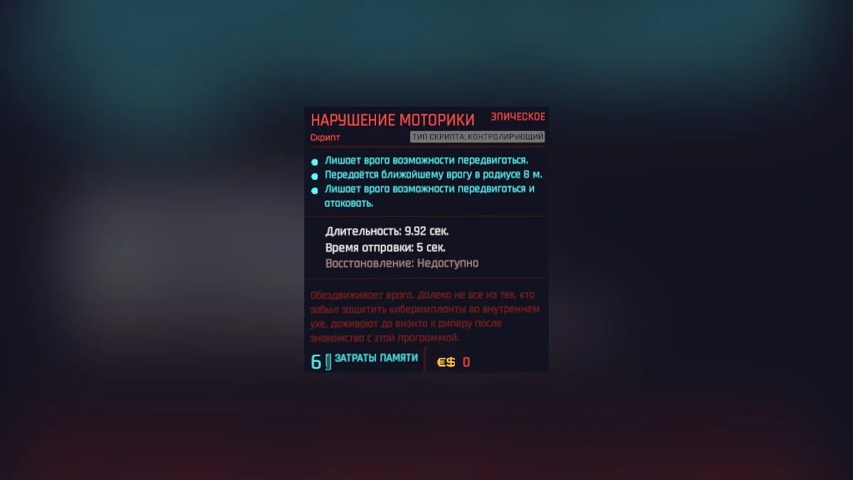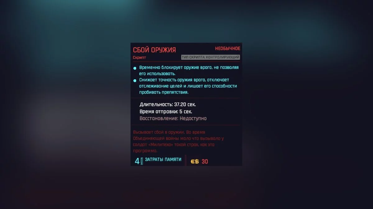 Оглушает противника и уменьшает возможность обнаружения. Изолирует цель от локальной сети и запрещает ей общаться со своими союзниками. Враги под воздействием любого скрипта отрезаются от локальной сети.