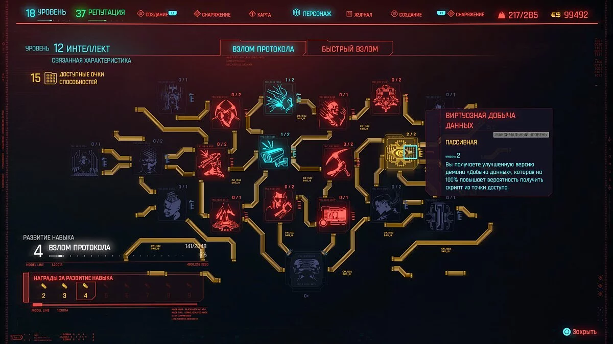 Существует ещё один способ получения легендарных скриптов. Для этого потребуется прокачать интеллект до 12 уровня и открыть способность 2 уровня «Виртуозная добыча данных». Отправляемся к любой точке доступа, для взлома к которой требуется 9 очков и более, и подсоединяемся к ней. Добываем данные только из третьего раздела. Процент выпадения очень мал, поэтому рекомендуется предварительно сохраниться перед точкой доступа.