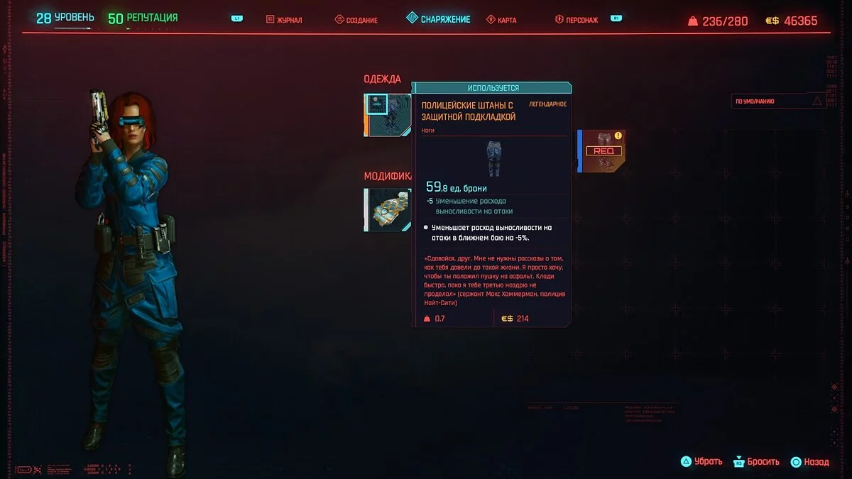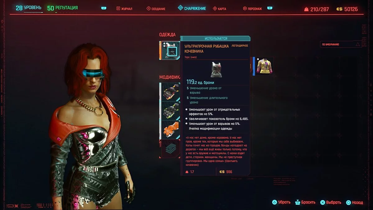 Перед тем как забирать одежду, нужно сохраниться. Дело в том, что у брони будет случайное число слотов для модификаций, от 0 до 4-х. Чтобы добиться максимальной защиты, нужно перезагружаться, пока не выпадет максимальное число слотов. Если после нескольких перезагрузок вы не получили нужное число слотов — вернитесь к этому комплекту одежды спустя время, когда ваш уровень будет выше. Некоторые виды брони могут зависеть от него.