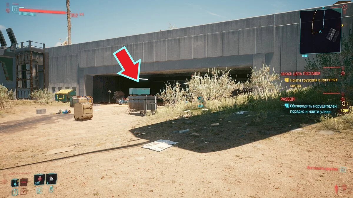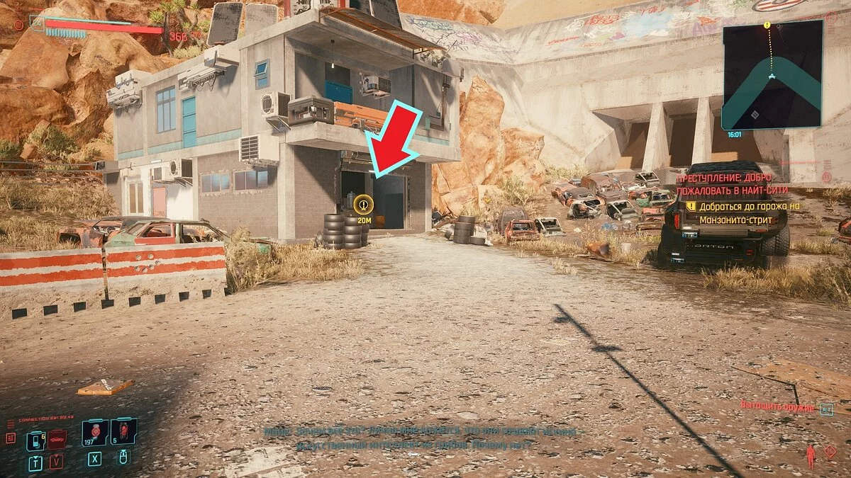 Вы активируете задание «Преступление: Добро пожаловать в Найт-Сити». Отправляйтесь по этому квесту в гараж Манзанита-стрит и перебейте всех врагов.