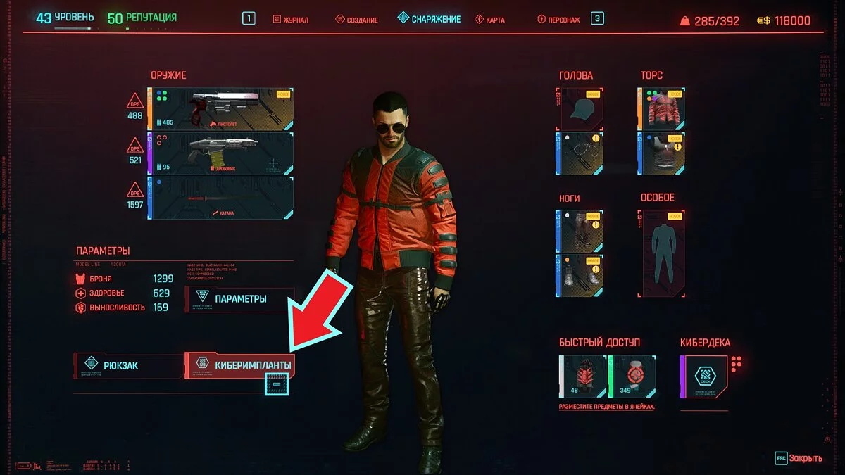 Затем откройте вкладку «Киберимпланты» и выберите имплант с ячейками для модификаций. Устанавливайте.