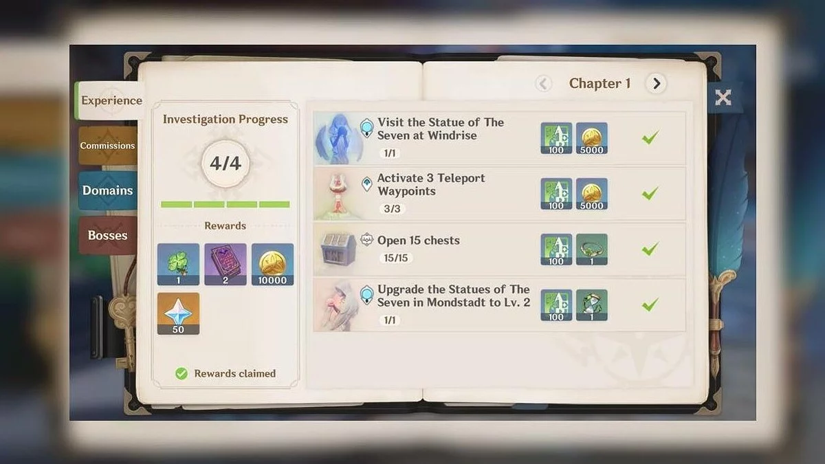 Также простым будет прохождение 4 и 5 глав «Руководства искателя приключений». В 4 главе вам необходимо будет улучшить статуи Семерых в Мондштадте до 6 уровня, а в 5 нужно найти 100 сундуков. За выполнение этих заданий вы получите еще по 1 ключу соответственно.