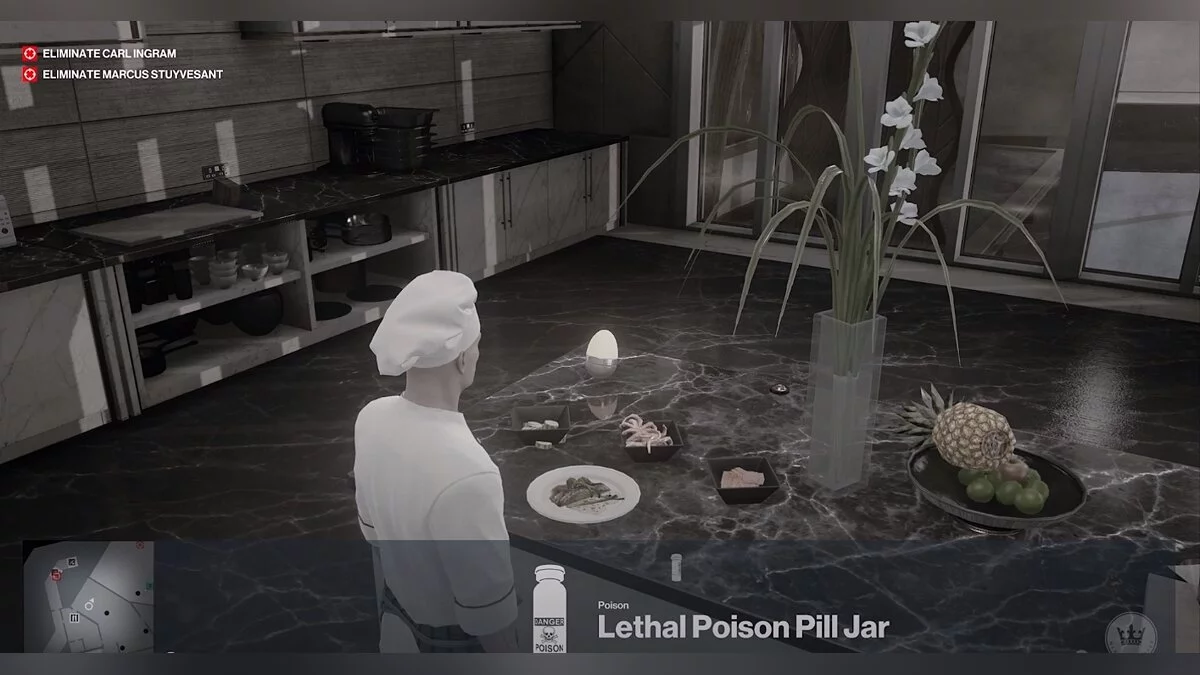 - Выбрать свой яд (Pick Your Poison): для начала нужен смертельный яд (lethal poison). В инвентаре у противника, маскировку которого вы должны получить на первом этапе сюжетной линии «Хищная птица» (Bird of Prey), можно найти смертельный яд (1 этаж, Садовая зона (Garden Area), убийца в чёрном костюме с зелёной рубашкой). Также вы можете получить смертельный яд на 10-м уровне мастерства в Берлине (Berlin) и добавить его в свою стартовую экипировку. Теперь идите в пентхаус на 4 этаж. Шеф-повар будет на кухне на этом этаже. Бросьте монету (можно найти на кухонном столе) в комнату за поваром, чтобы заманить его туда. Используйте его одежду, чтобы замаскироваться. Теперь взаимодействуйте с тарелкой на кухонном столе, чтобы приготовить еду. Добавьте смертельный яд и позвоните в колокольчик, чтобы подать сигнал о том, что еда готова. А теперь подождите, пока Инграм придёт и съест это. Работает только со смертельным ядом;