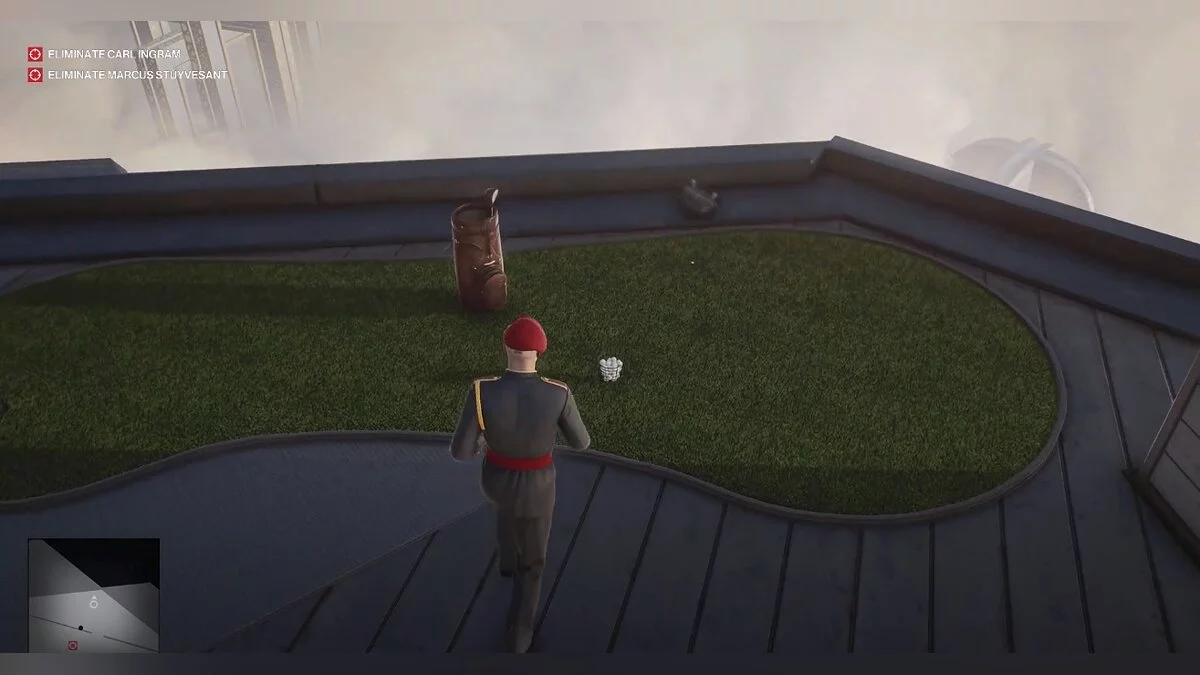- Крутая задача (Steep Task): когда начнётся миссия, очень быстро бегите на вершину пентхауса (5 этаж) и используйте маскировку охранника (Penthouse Guard). Здесь Инграм ходит по балкону и иногда опирается на перила. Толкните его сзади;