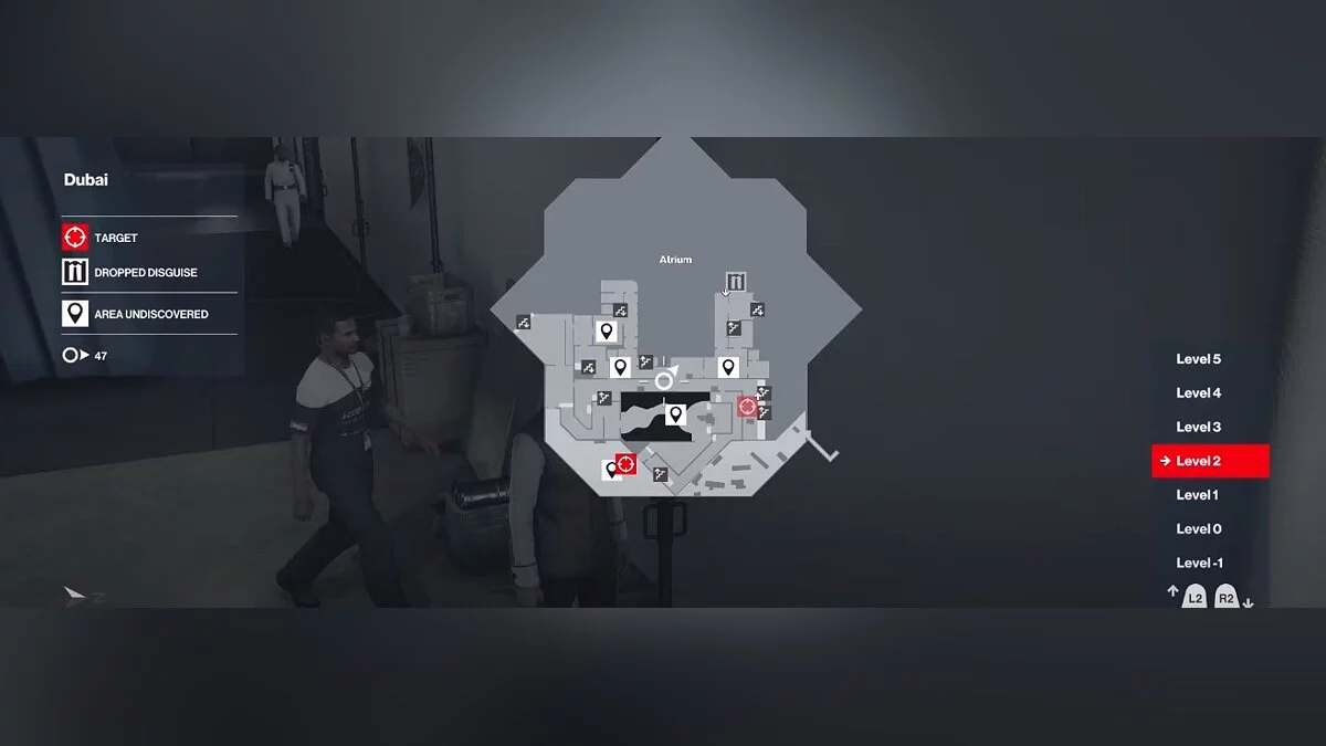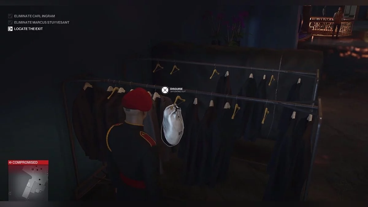 - Костюм для скайдайвинга (Suiting Attire): вы найдёте костюм на -1 этаже в Атриуме (Atrium). Взаимодействуйте со стойкой для костюмов, затем используйте любой выход (после того, как обе цели будут мертвы);