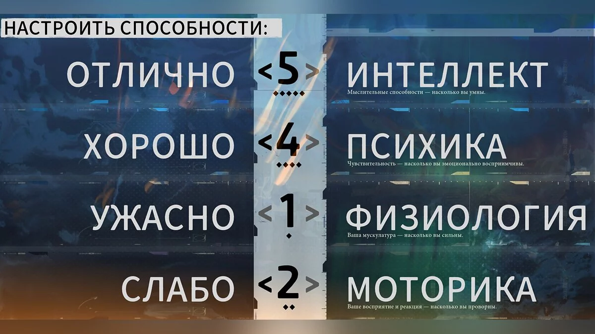 Мускулатуру рекомендуется прокачать хотя бы до двух единиц, иначе у героя не будет права на ошибку, и любое ранение сразу же приведёт к смерти. В игре не часто требуется применение физической силы, поэтому гораздо полезнее задействовать навыки интеллекта и психики. Наш стартовый выбор способностей опирается именно на эти показатели: