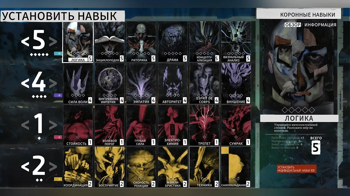 Для распределения доступно 8 очков, при этом каждая способность уже имеет стартовое значение 1. Навыков в игре всего 24 штуки, по 6 на каждую ветку развития. Все навыки автоматически получают значение, равное показателю способности. Например, вкачиваем интеллект на 6 и все навыки в этой ветке примут значение 6. На старте игры дополнительно улучшается только один навык, поэтому рассмотрим их более подробно.