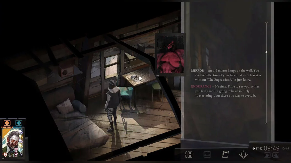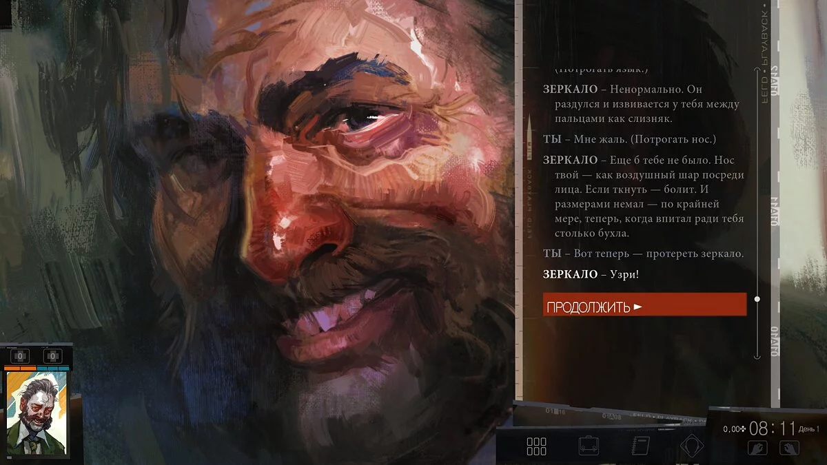 По окончании разговора идём в свой номер или в хижину старушки. Финал задания зависит от успешности проверки стойкости при осмотре зеркала. При удачном использовании навыка герой сбреет усы и его иконка изменится.