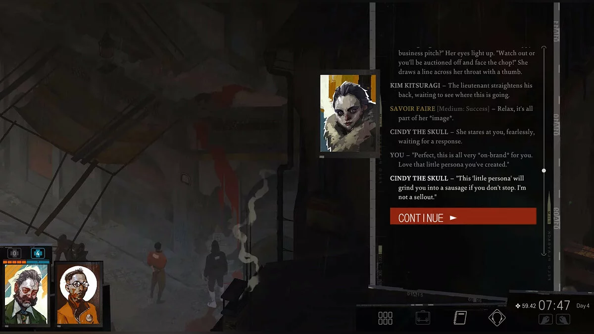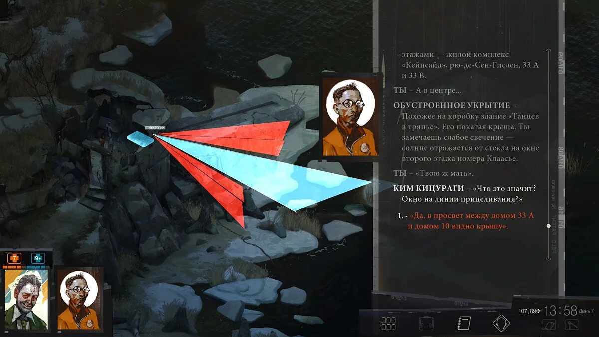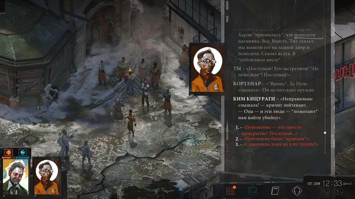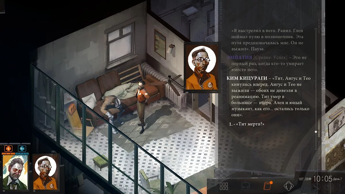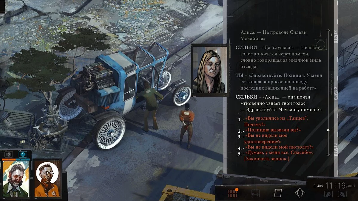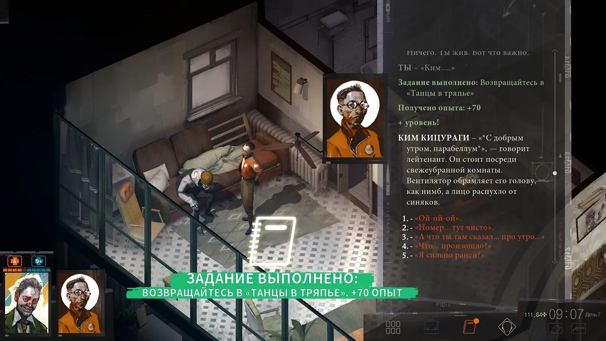 Звоним Сильви по рации и сначала спрашиваем про удостоверение, пистолет и форму. В разговоре с сознанием ссылаемся на отсутствие униформы у Кима, иначе потеряем одно очко боевого духа. Спрашиваем про увольнение и отсутствие желания рассказать сложившуюся ситуацию на работе. Персонаж предположит, что вина лежит на нём, но девушка не ответит на этот вопрос. Можем упомянуть Гарта, но конечный результат окажется отрицательный. Задаём вопрос о звонке в полицию и стараемся не проявлять агрессию. Девушка упомянет профсоюз, поэтому спрашиваем о нём у напарника. Сильви больше ничем не сможет помочь, а задание обновится.