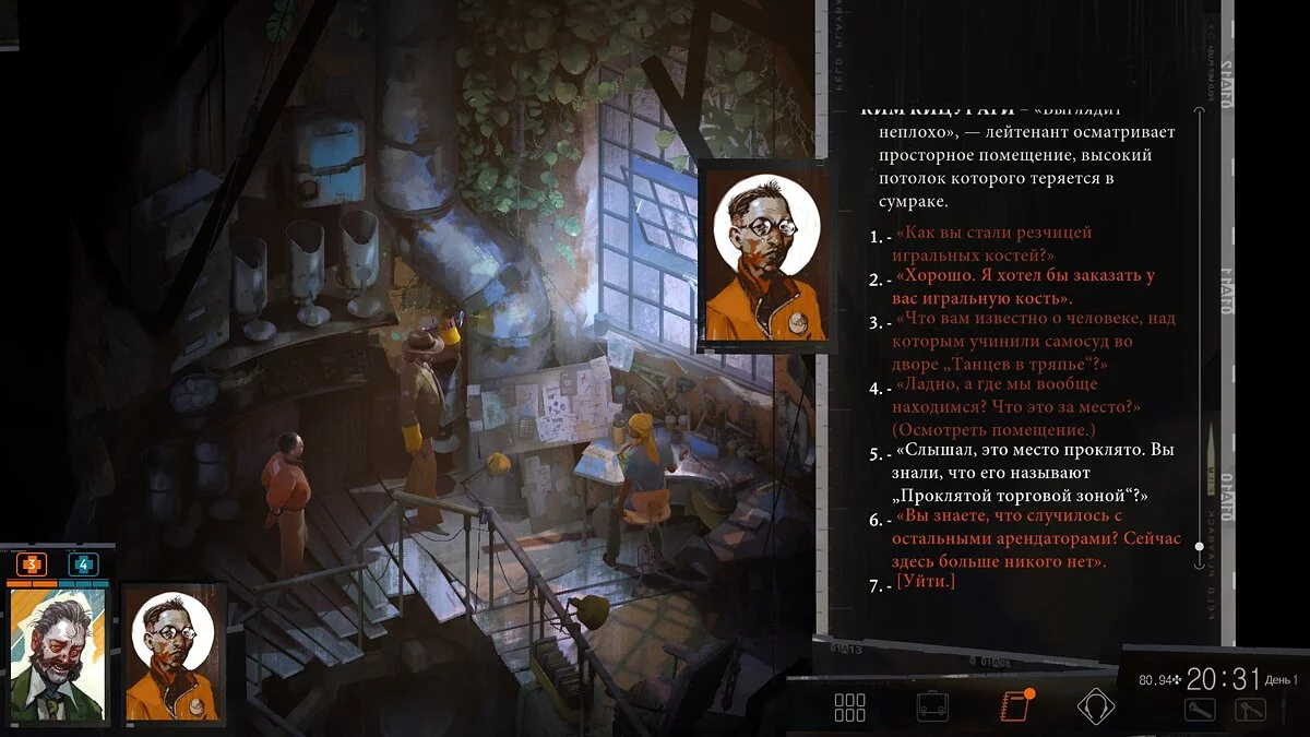 Возвращаемся в комнату с компьютером, проходим в открытую дверь справа от высокотехнологичного устройства и поднимаемся по лестнице на второй этаж. Знакомимся с девушкой и узнаём, что она занимается изготовлением различных игральных костей. Спрашиваем про тело во дворе, но ничего полезного не узнаём. Спрашиваем у резчицы игральных костей о разорившихся компаниях и соглашаемся с ней насчёт виновности капитализма в банкротстве таких предприятий.