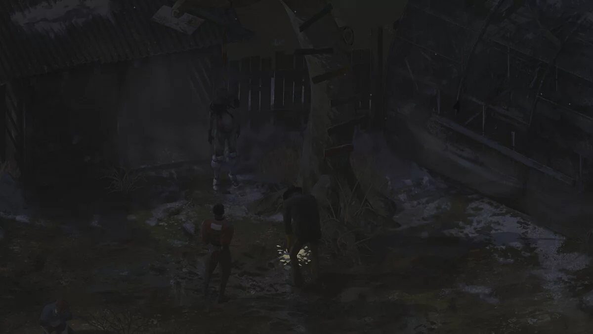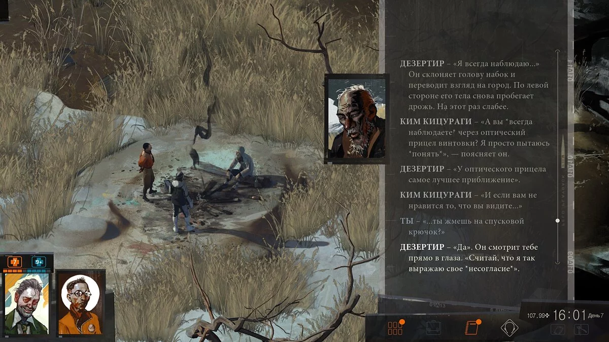 Следуем к открывшемуся проходу и выходим на улицу сзади бункера. Доходим до мужчины у костра и разговариваем с ним. Расспрашиваем про оружие в его руках и просим опустить его. Проходим проверку авторитета, и дезертир бросит винтовку к ногам детективов, в которой и так не окажется патронов. Поднимаем оружие и внимательно его осматриваем.
