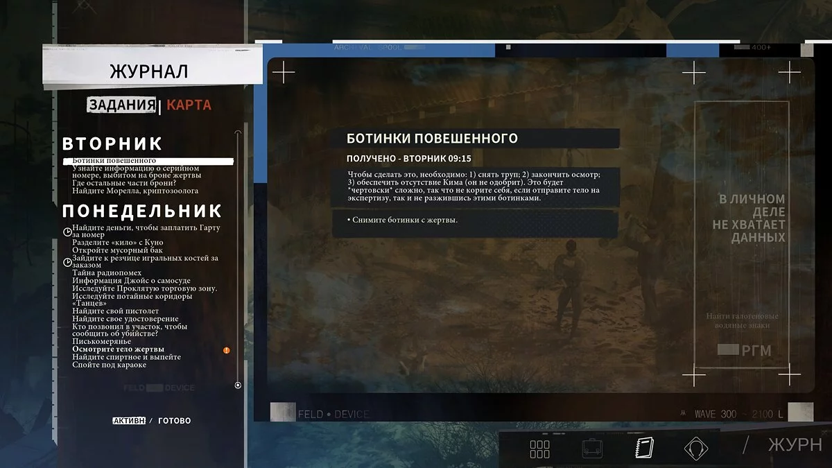 Подходим к девушке с сигаретой. Расспрашиваем её о статусе героя и узнаём, что он является полицейским, которые четвертый день расследует смерть человека. Не рекомендуется пытаться подкатить к девушке, иначе в дальнейшем это может привести к негативным последствиям. Спускаемся в вестибюль и изучаем различные предметы с зелёным маркером. Осматриваем спящего человека за стойкой около входа и забираем «Магний», который потребуется для восстановления боевого духа. Можно попытаться разбудить его и допросить, но он не расскажет герою ничего интересного. Обязательно изучаем микрофон и осматриваем бутылку возле пьяницы, чтобы получить задания.