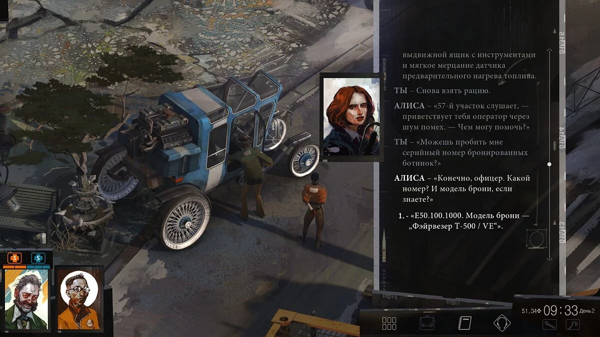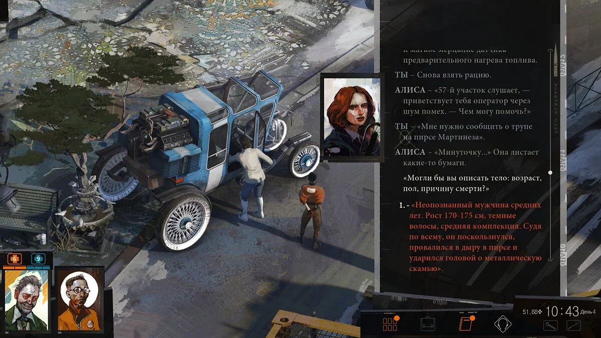 Используем рацию в карете и просим соединить с 41-м полицейским участком. Сообщаем о пропаже удостоверения. Коллеги главного героя негативно отреагируют на ситуацию, поэтому персонажу придётся самому искать документы. При вопросе о пистолете пытаемся использовать навык драмы и при успешном действии можем соврать о пропаже. В ином случае можем попытаться угадать оружие, выбрав револьвер или придётся выслушать очередные насмешки полицейских и признаться в отсутствии пистолета. Запрашиваем дополнительную финансовую поддержку и пытаемся узнать своё имя, но результат в любом случае будет отрицательным. По окончании разговора с полицейским участком откроется два задания на поиск пистолета и удостоверения.