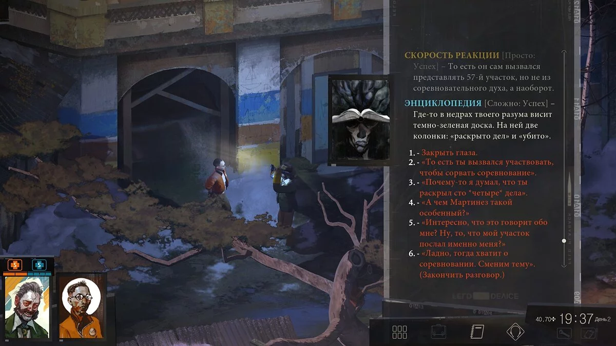 - Энциклопедия. Задействует все знания и позволяет вспоминать различные события. Пригодится во многих ситуациях, не только при изучении локаций, но и в разговорах и осмотре места преступления.