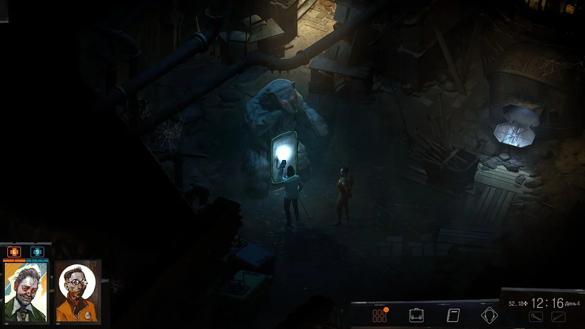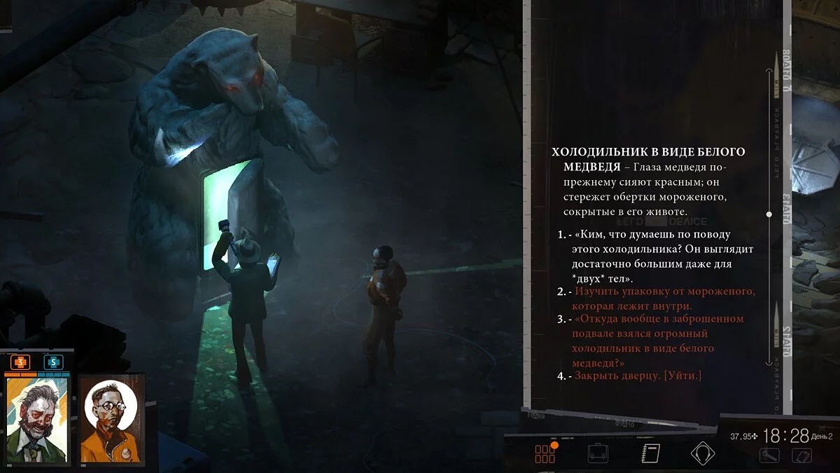 Открываем ближайшую дверь и оказываемся на задворках. Осматриваем внутренности холодильника, который встроен в огромного медведя в центре локации. Изучаем записку и проходим к дверце котла справа. Заглядываем внутрь и сообщаем Киму, что слышим какие-то голоса сверху. Все паранормальные варианты ответов всегда пропускаем и не используем. Пытаемся докричаться до людей и при успешной проверке навыка слышим, как неизвестная девушка просит подняться полицейских на второй этаж.