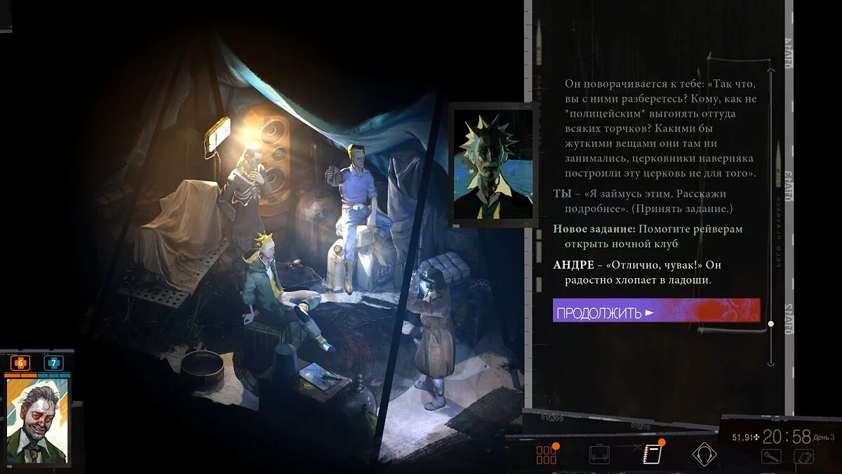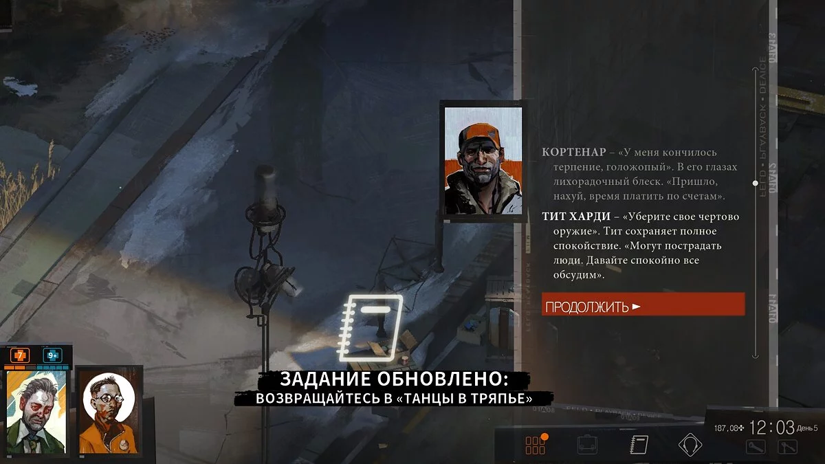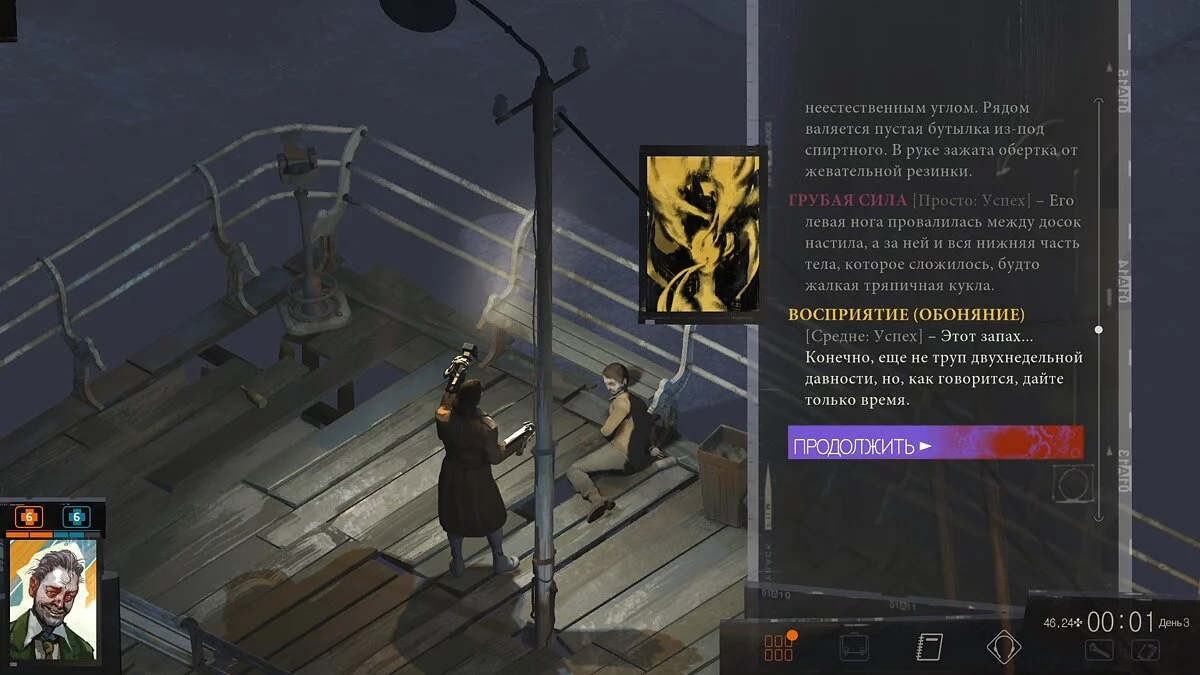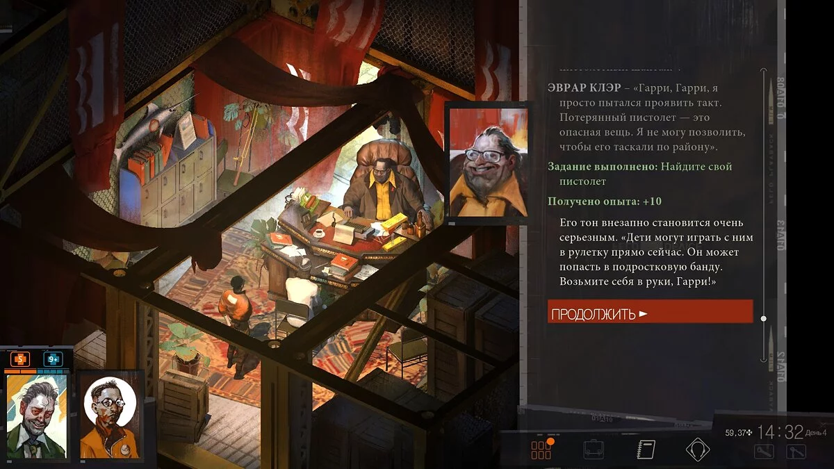 После окончания допроса управляющий попросит заплатить за выпивку, разбитое стекло и бардак в номере. Можем проявить чудеса эквилибристики и увидеть эпичную сцену, но лучше расспросить его про реалы. Выбираем «Вы арестованы» и используем навык авторитета. При успешном использовании навыка можно вычеркнуть из долга уборку номера и разбитое окно, выбрав соответствующие реплики. Появится задание «Возместите ущерб».