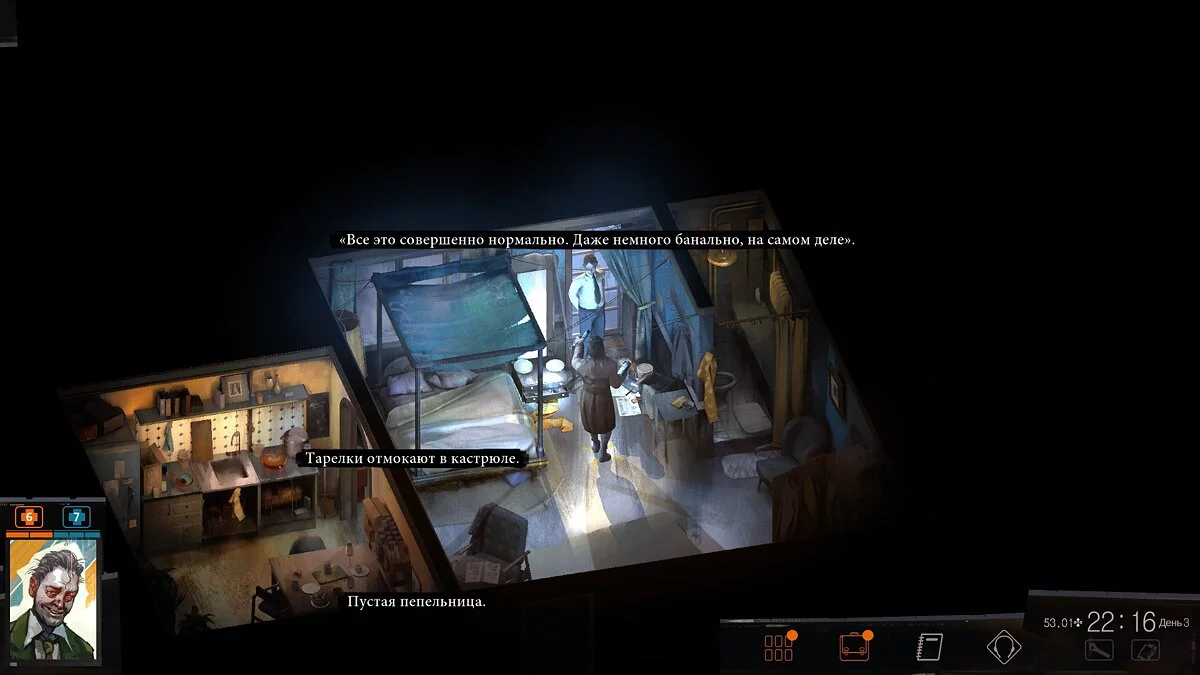 Герой просыпается на полу гостиничного номера и не помнит, что с ним произошло. Вокруг разбросаны бутылки от различных алкогольных напитков. Прежде всего необходимо собрать разбросанные по комнате вещи. С пола поднимаем штаны, а с кровати забираем пиджак. У героя над головой появится маркер. Подобного рода указатели подсказывают игроку о наличии каких-либо мыслей у персонажа или возможности поговорить со своим подсознанием.