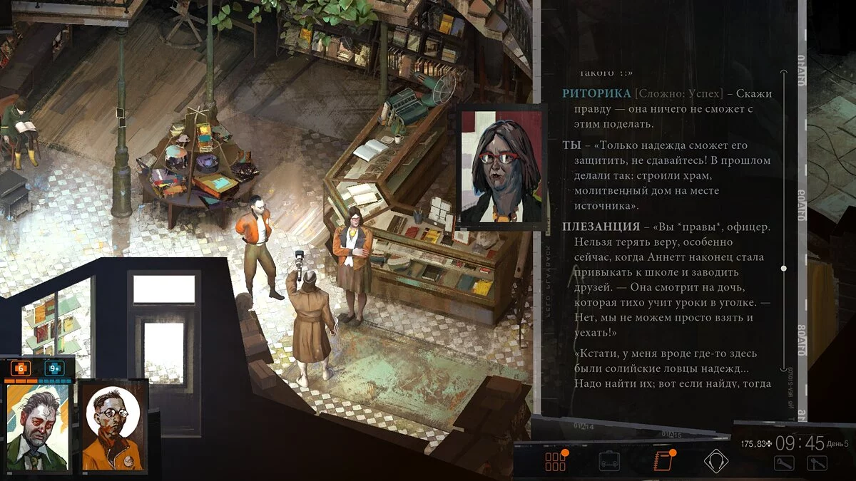 Выходим на улицу и идём к магазину книг налево. Осматриваем прилавки и общаемся с девочкой. Она расскажет о том, что забросила школу и помогает маме с магазином. Выбираем все реплики поочередно и получаем немного информации. Спрашиваем у девочки про детективы и соглашаемся применить дедуктивные способности. При успешной проверке навыка узнаём, что девочка часто грызёт ногти и выдвигаем предположение, что она недовольна текущей обстановкой в семье. Заканчиваем разговор с Аннет и проходим внутрь магазина.