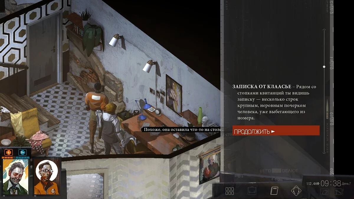 Дверь в комнату напарника будет открыта, поэтому можем пройти внутрь и осмотреть её. После этого выходим в коридор и следуем в номер Клаасье. Изучаем заметку на столе, в которой девушка сообщит о своей невиновности и подарке, который она оставила наверху. Поднимаемся в верхнюю комнату и осматриваем окно.