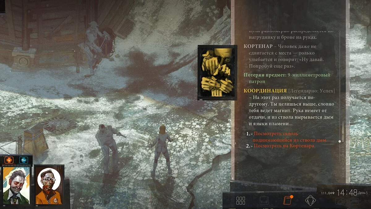 - Используем навык, чтобы застрелить Кортенара. Если первая проверка оказалась неудачной, то пытаемся ещё раз воспользоваться координацией.