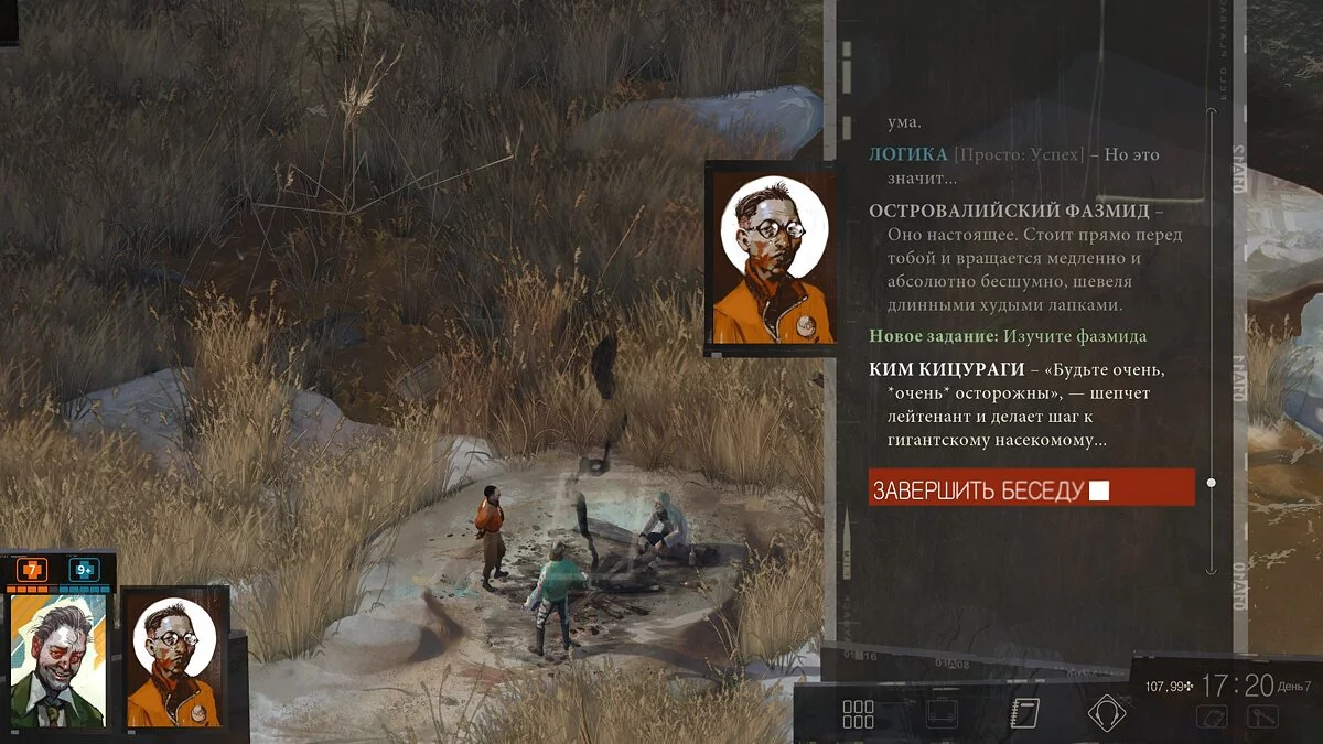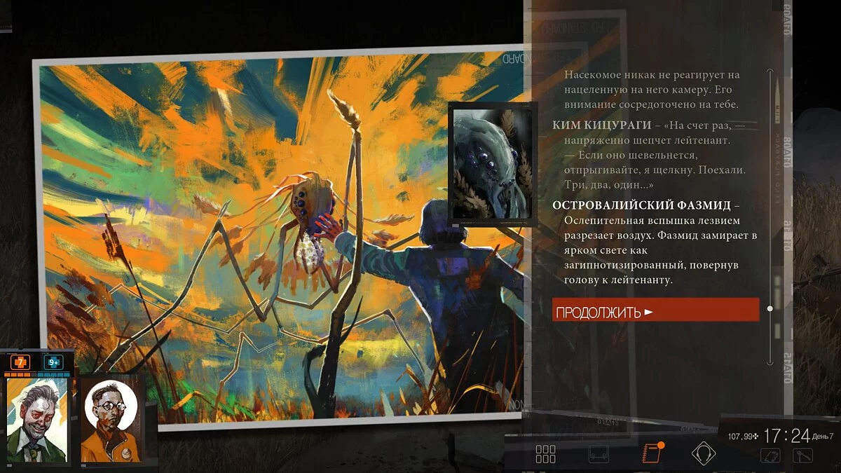 Герой заметит что-то странное в высокой траве. Оттуда вылезет островалийский фазмид и полицейскому выдастся шанс осмотреть его. Идём к существу и используем проверку элетрохимией, чтобы подойти к нему поближе. Просим Кима сфотографировать островалийского фазмида Дотрагиваемся до существа и слизываем жидкость с пальца. Выбираем оставшиеся варианты и используем внутреннюю империю, чтобы поговорить с существом.