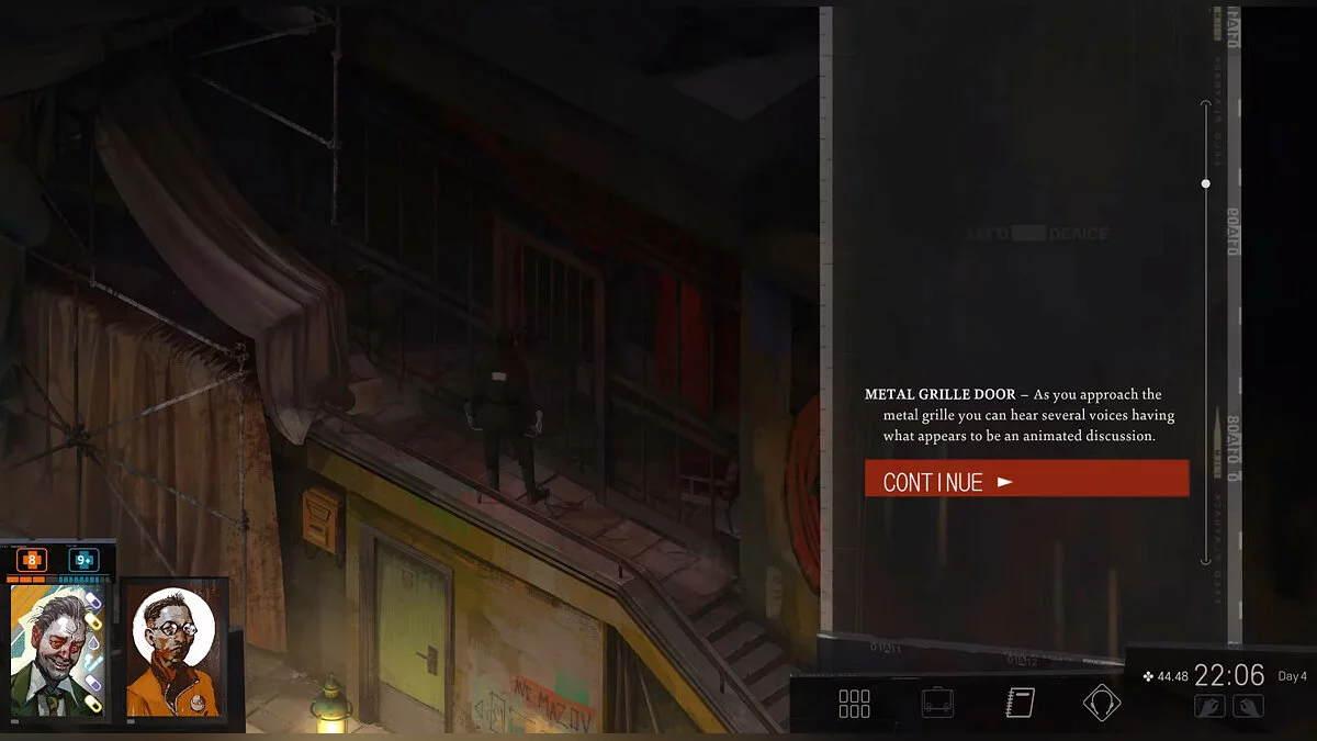 Выходим на улицу и переходим дорогу к автомобилям. Можем пообщаться с дальнобойщиком и пройти на задний двор. В ящике находим рубашку и следуем в сторону забастовки. Дорога в порт закрыта и путь преграждает огромный амбал, но можно поговорить с несколькими людьми и узнать побольше информации о текущей ситуации. Рядом с аптекой Фриттте находим горстку монет на земле и возвращаемся после часа дня в гостиницу. На открывшейся кухне болтаем с поваром и осматриваем синюю дверь. Договариваемся с Кимом провести расследование и получаем соответствующее задание на исследование потайных коридоров бара в гостинице.