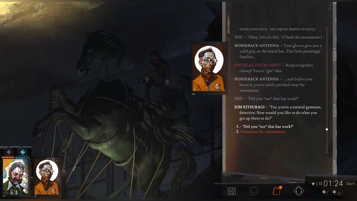 Перед тем, как ложиться спать, рекомендуется сохраниться в обязательном порядке, так как за всю игру выполнить это задание можно только один раз. Выбрав одну из веток политического квеста, остальные сразу же станут недоступными. Это поможет вернуться к нужному времени и выбрать другой вариант, чтобы узнать все возможные события. Каждый квест принесёт пользу выбранному навыку в дальнейших разговорах. Также перед сном необходимо развить одну из идей в кабинете мыслей: