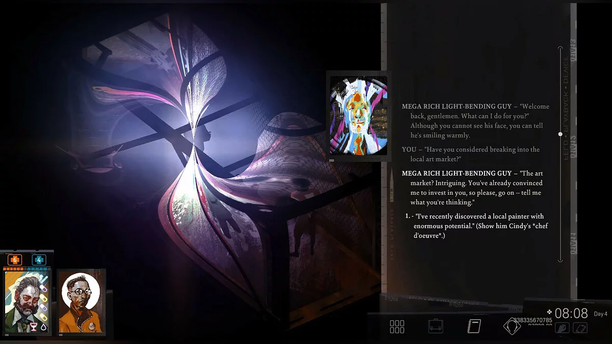 Предлагаем ему инвестировать деньги в художественный магазин. Идея главного героя сразу же понравится мужчине, поэтому рассказываем ему все подробности. Получаем биржевой сертификат и передаём картину загадочному человеку Синди Череп.