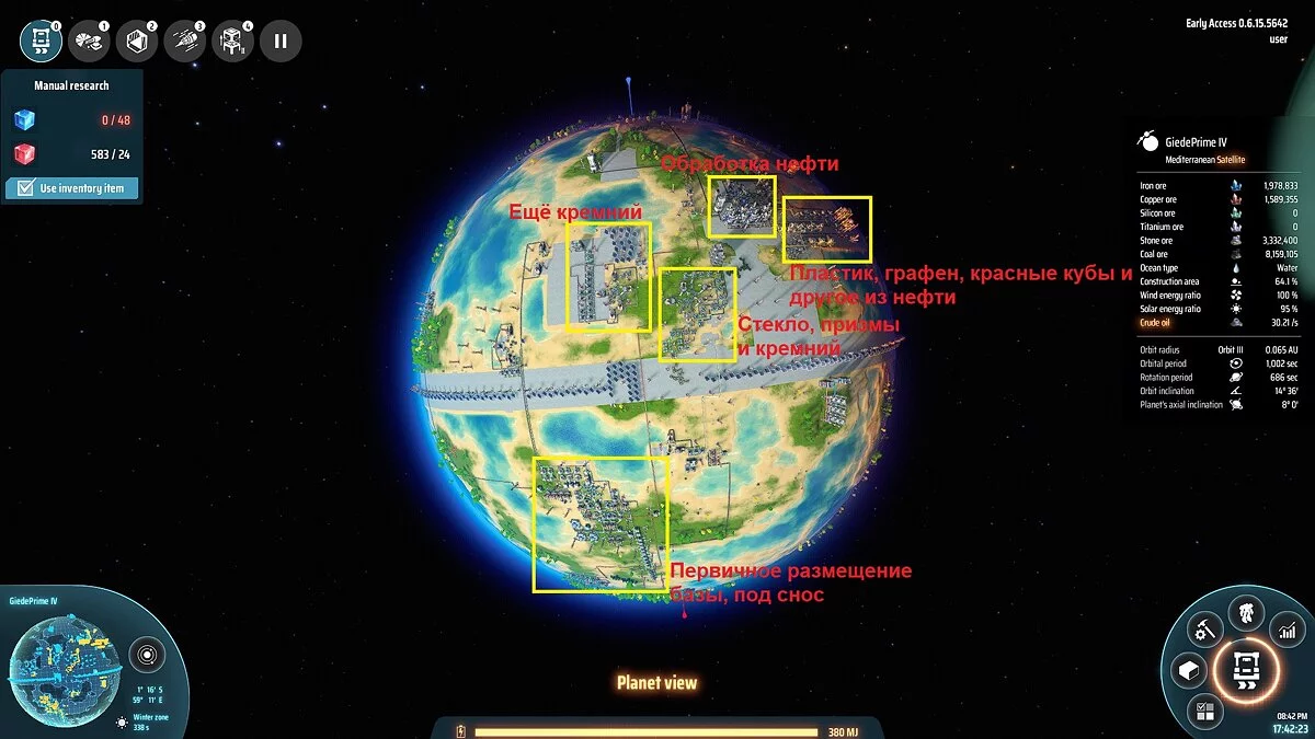 Третье правило: займите одно полушарие. Во время разведки оцените, на северном или южном полушарии больше ресурсов и выгоднее начальные позиции, и выберете одно из них как основное. Другое полушарие используйте для первичной обработки сырья, размещения лабораторий и объектов строительства сферы Дайсона, а вот сложной переработкой/производством там не занимайтесь. Одно это убережёт от излишне длинных маршрутов по доставке из одного полушария в другое и обратно.
