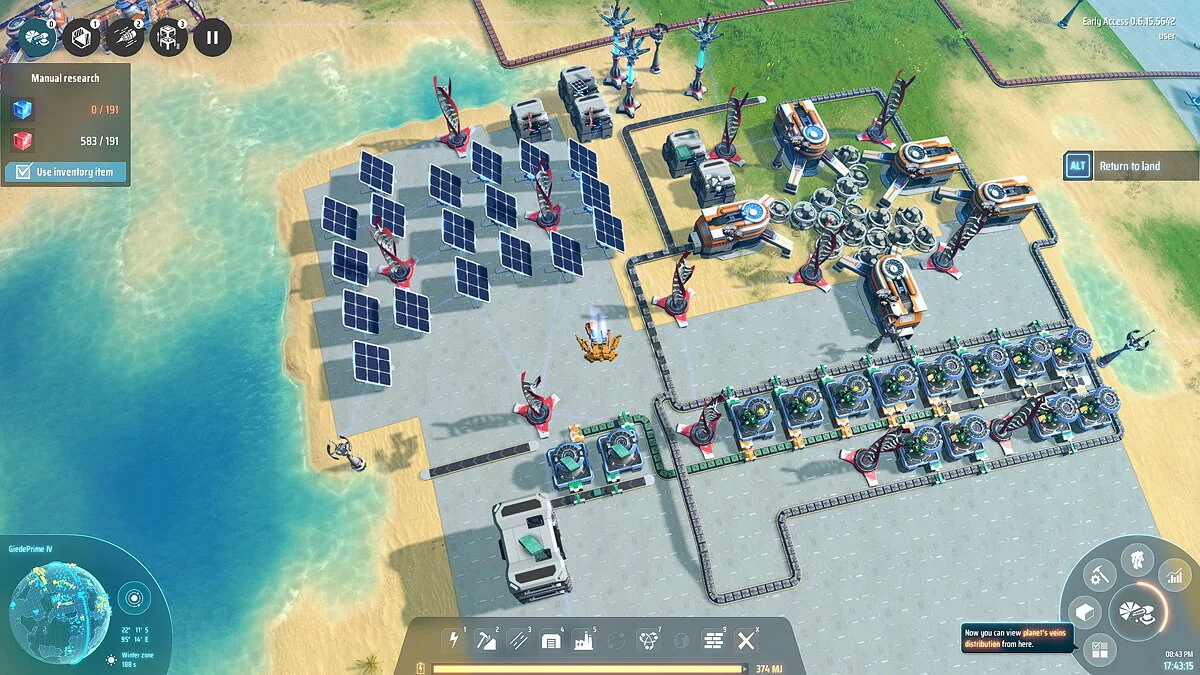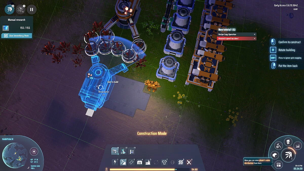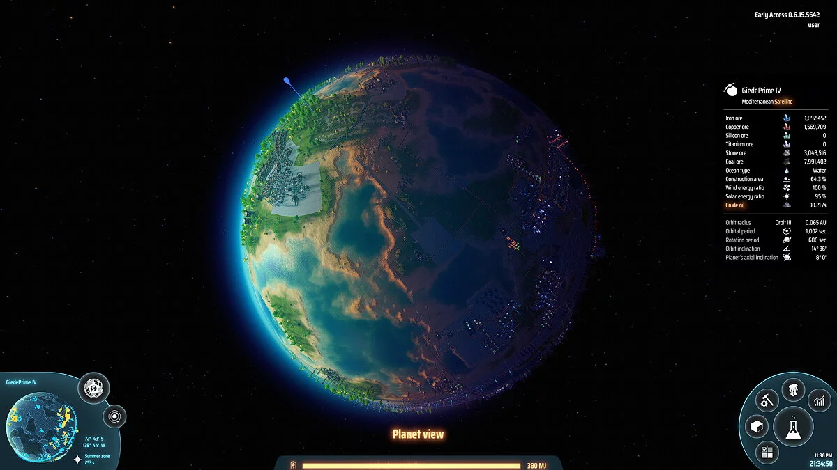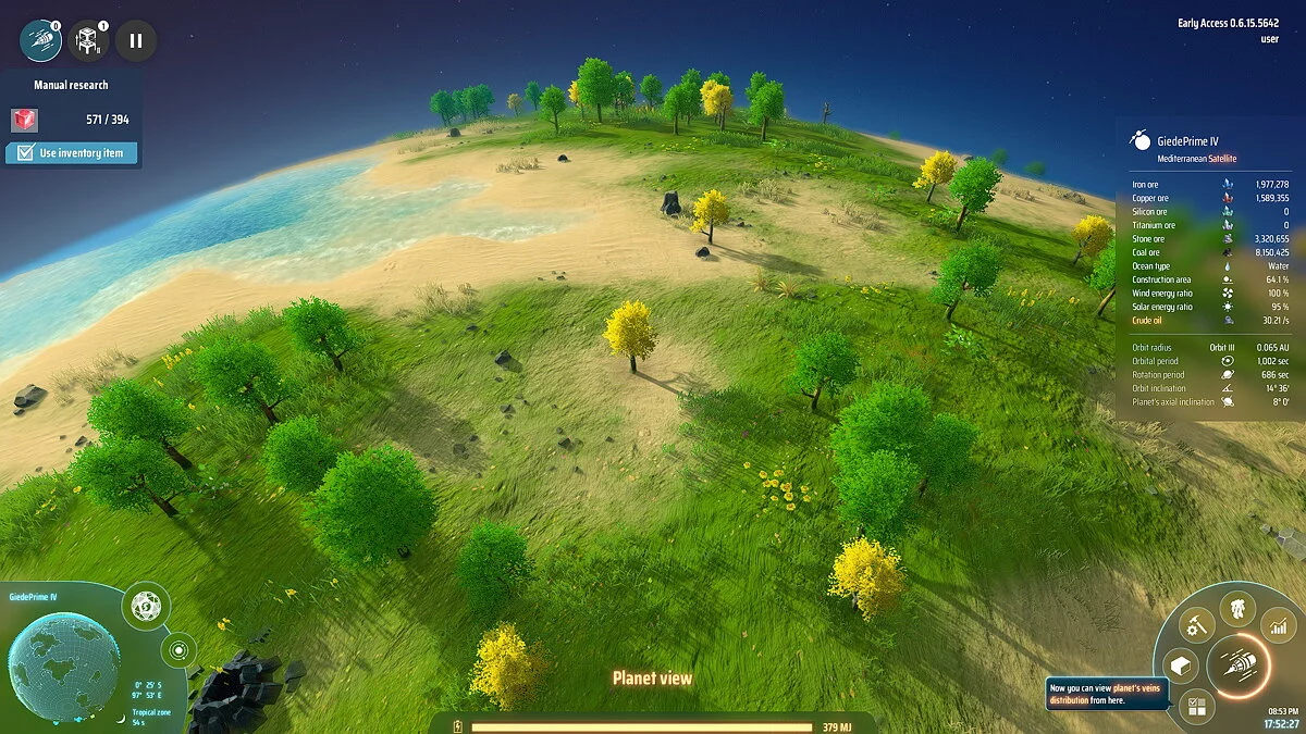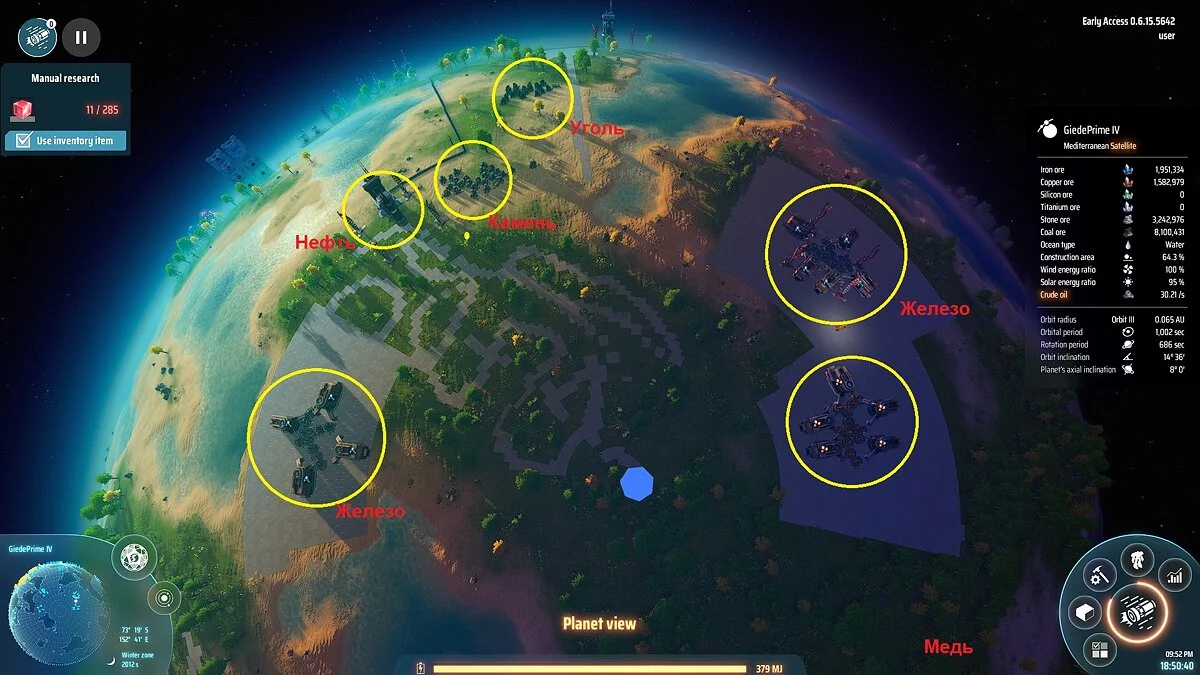 В Dyson Sphere Program игровой мир генерируется случайным образом, поэтому прежде, чем что-либо делать, изучите планету. Для этого нажмите на её иконку в левом нижнем углу и используйте среднюю кнопку мыши для прокрутки: