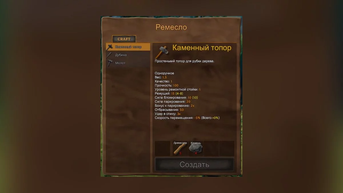 - Из веток и камней можно создать каменный топор (древесина — 5, камень — 4) и молот (древесина — 3, камень — 2). Это самые базовые предметы, создание которых доступно с самого начала игры. Каменный топор нужен, чтобы рубить мягкие породы дерева и убивать врагов в начале игры, а молот — для строительства, создания верстака и костра;