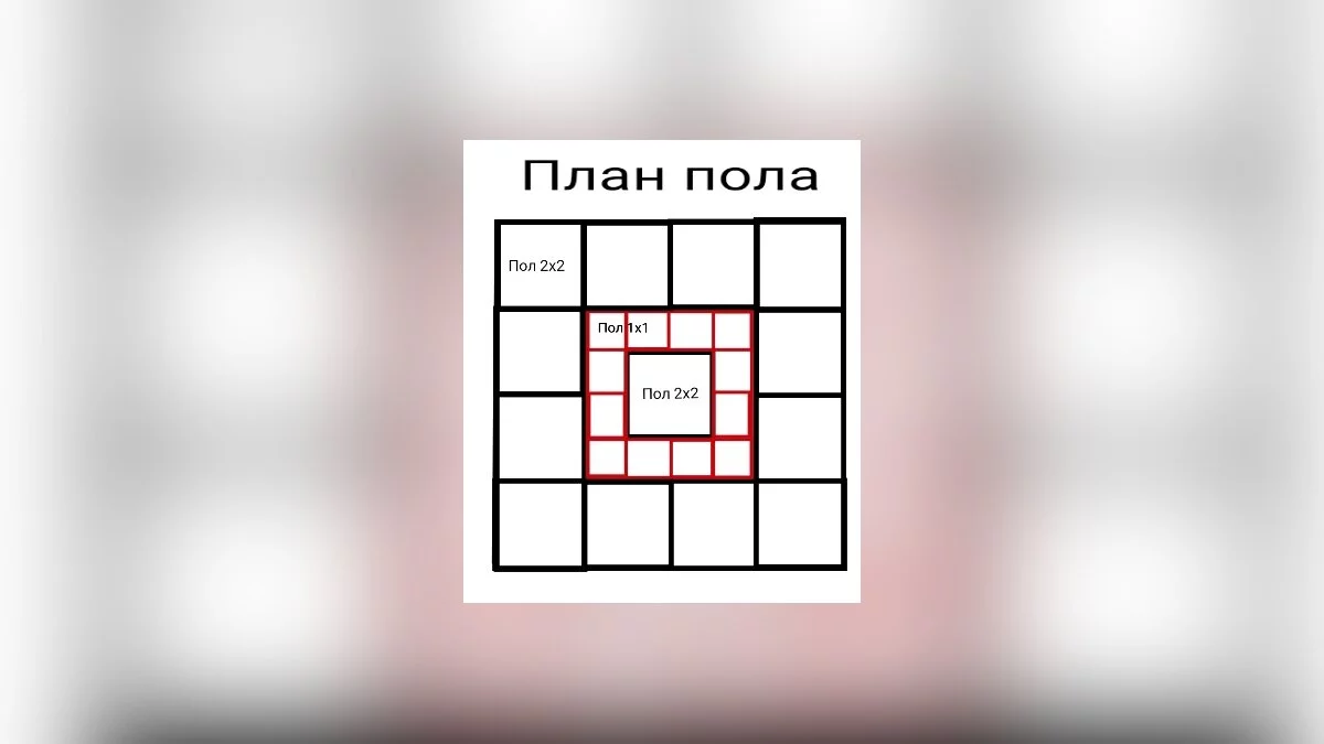- По периметру готового пола поставьте деревянный пол 1х1 — должно получиться 12 таких квадратов (смотрите приведённый ниже план и используйте его как схему);