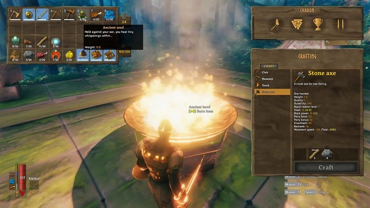 Что можно получить: «трофей: Эйктюр» (Eikthyr trophy) и 3 «твёрдый рог» (Hard antler). Трофей можно повесить на одном из пяти камней, которые вы увидите в самом начале игры. Герой получит снижение расхода выносливости на бег и прыжки на 60% на 300 секунд. Твёрдый рог позволит сделать кирку из оленьего рога, которая необходима для добычи камня (Stone), меди (Copper) и олова (Tin).