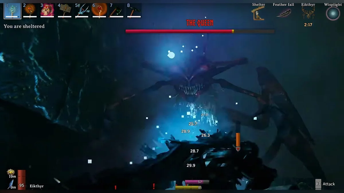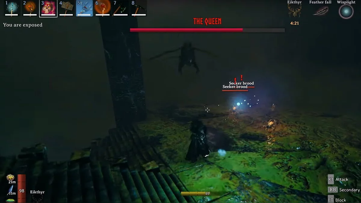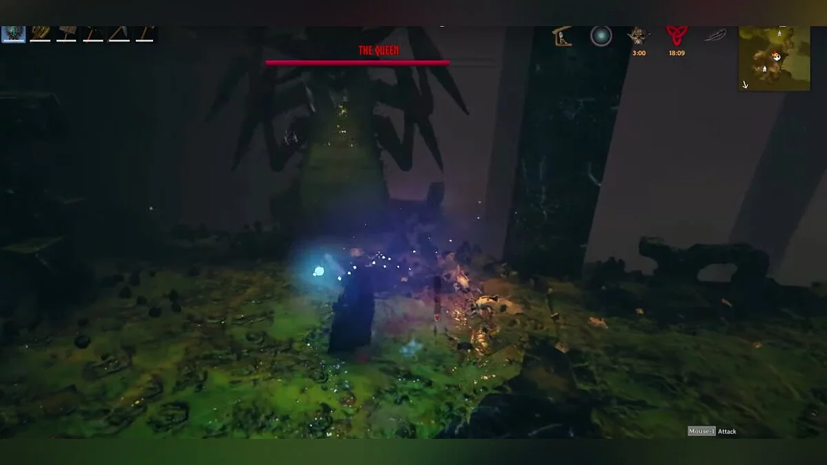 The Queen (Королева) — шестой босс Valheim, которого вы встретите в Туманных землях (Mistlands). Внешне она напоминает огромное насекомое. Во время боя Королева вызывает искателей — агрессивных мобов, которые помогают ей в сражении.