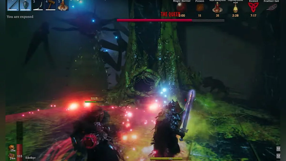 Если вы играете в одиночку, то вам стоит полагаться на дальний бой. В качестве оружия подойдут арбалет, Посох углей (Staff of embers) или Посох мороза (Staff of frost). Подробнее обо всём, что связано с магией, мы рассказали в отдельном гайде. При кооперативном прохождении лучше распределить роли между игроками. Например, боец ближнего боя в тяжёлых Панцирных доспехах принимает урон на себя, а ему помогает чародей, который облачён в броню Эйтра (Eitr Armour). Если вы сражаетесь в ближнем бою, воспользуйтесь оружием со стихийным уроном, например, Himmin Afl.