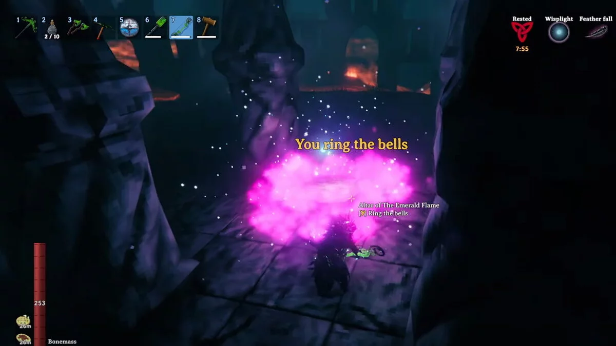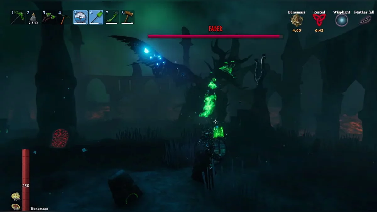 Вам нужно отыскать Изумрудное пламя Вегвезира в Гнилых дырах. Когда обнаружите его, нажимайте на кнопку действия. На карте появится арена, куда можно призвать Фейдера. Однако вам потребуется найти девять фрагментов колокола. Их вы тоже обнаружите во время изучения Гнилых дыр. Соберите из этих элементов три осколка в Чёрной кузнице и разместите на определённых местах арены.