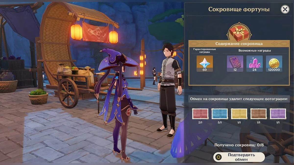 Для получения награды вам нужно обменять один комплект снимков (по 1 фотографии каждого цвета) на сокровище фортуны. Внутри сокровища гарантировано находятся 60 камней истока, а также есть шанс получить опыт героя, руду и мору. Произвести обмен можно у Цзи Туна в Ли Юэ. Получить можно не более 8 сокровищ.