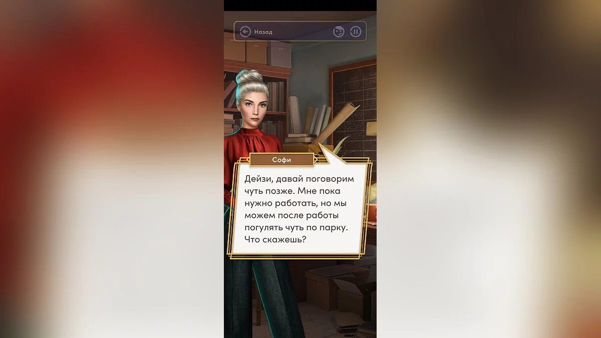 Софи думает, куда пойти: в библиотеку и поговорить с Бенедиктом, в кофейню и по пути поболтать с Диего или сразу за кофе. Следующий выбор разветвляет сюжет, но вы сможете взаимодействовать сразу с двумя героями. «Я пойду...»: