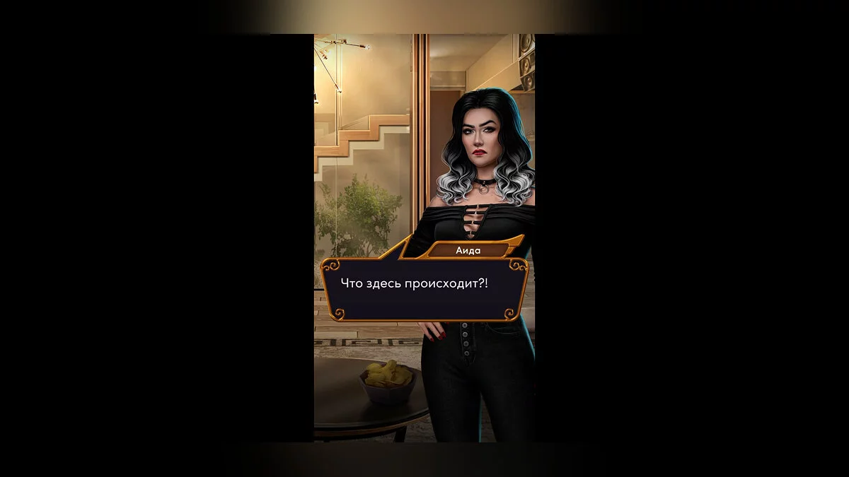 Героиня вместе с друзьями и Аидой находятся в гостиной.
