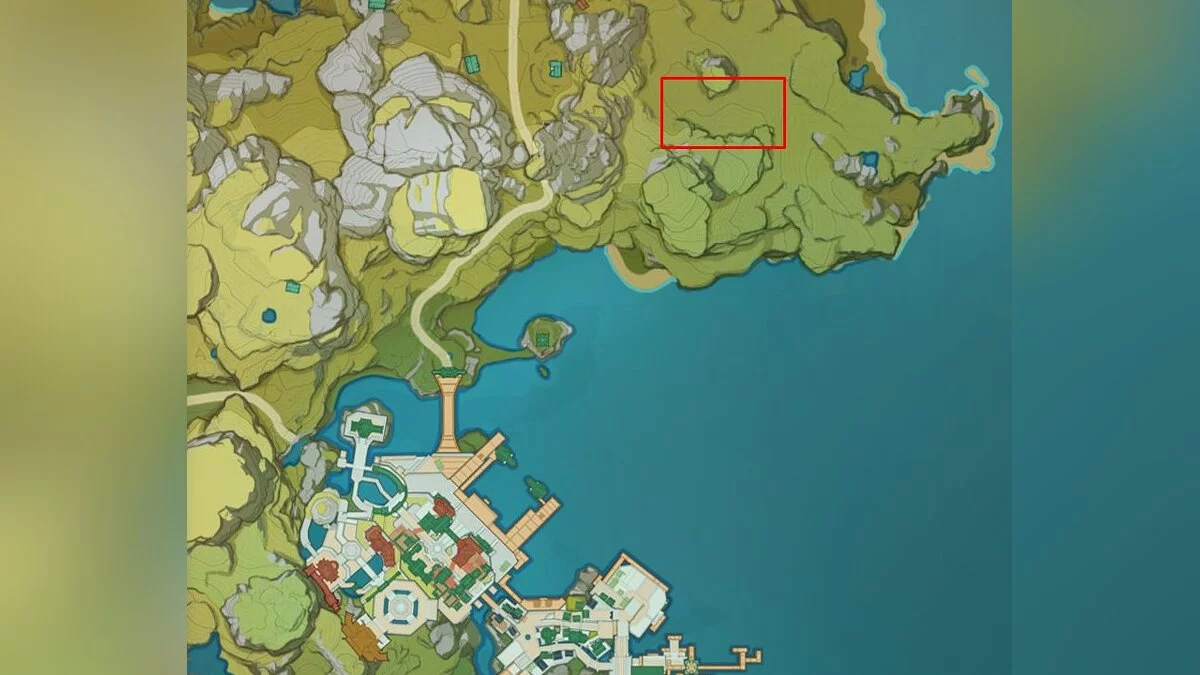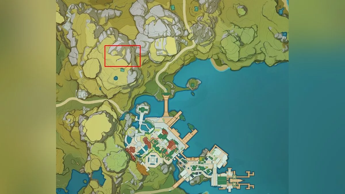 - Получите азурит из левитационных семян. Для этого отправляйтесь в горы к северу от гавани (отмечено на карте) и найдите большое растение с бирюзовыми бутонами. Подойдите к растению и осмотрите его, тогда бутоны взлетят в небо. Выберите персонажа с дальнобойными умениями, чтобы стрелять по бутонам;
