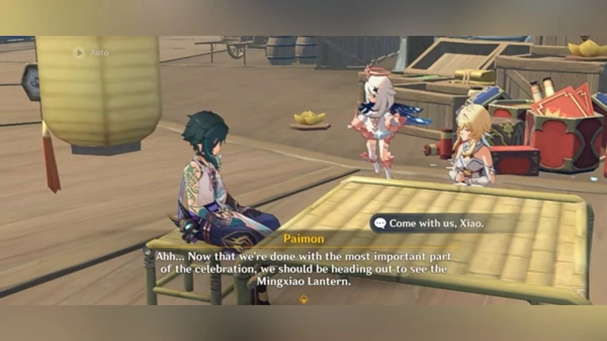 - Задание «Праздничные обещания» начинается с разговора с Улыбчивым Янь Сяо, затем нужно поговорить с Верр Голдет, которая попросит отдать небесный фонарик малышке Мин. За этим отправляемся в указанное на большой карте место. Малышку Мин вы найдёте в лесу рядом с постоялым двором с наступлением ночи. С ней надо поиграть в прятки. После игры повесьте фонарик на указанное дерево и отправляйтесь обратно к Верр Голдет, чтобы получить 30 примогем, 20 000 моры и 100 праздничной жары.